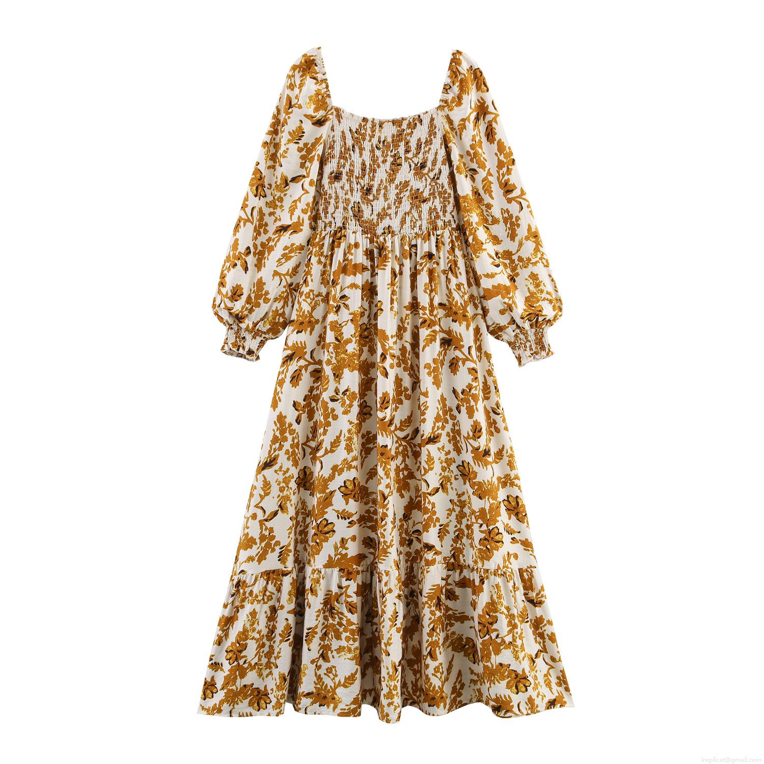 • Women's Smocked Square Neck Maxi Dress Floral Leaf Print Puff Sleeve Bohemian Vacation Long Dress With Tiered Hem Elegant Smocking Bodice Flowy Beach Party Dress
