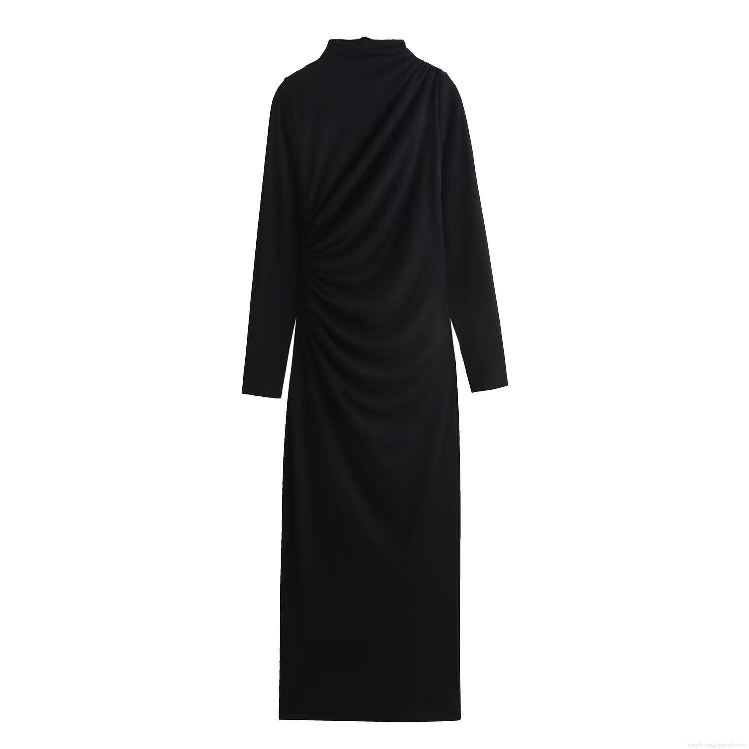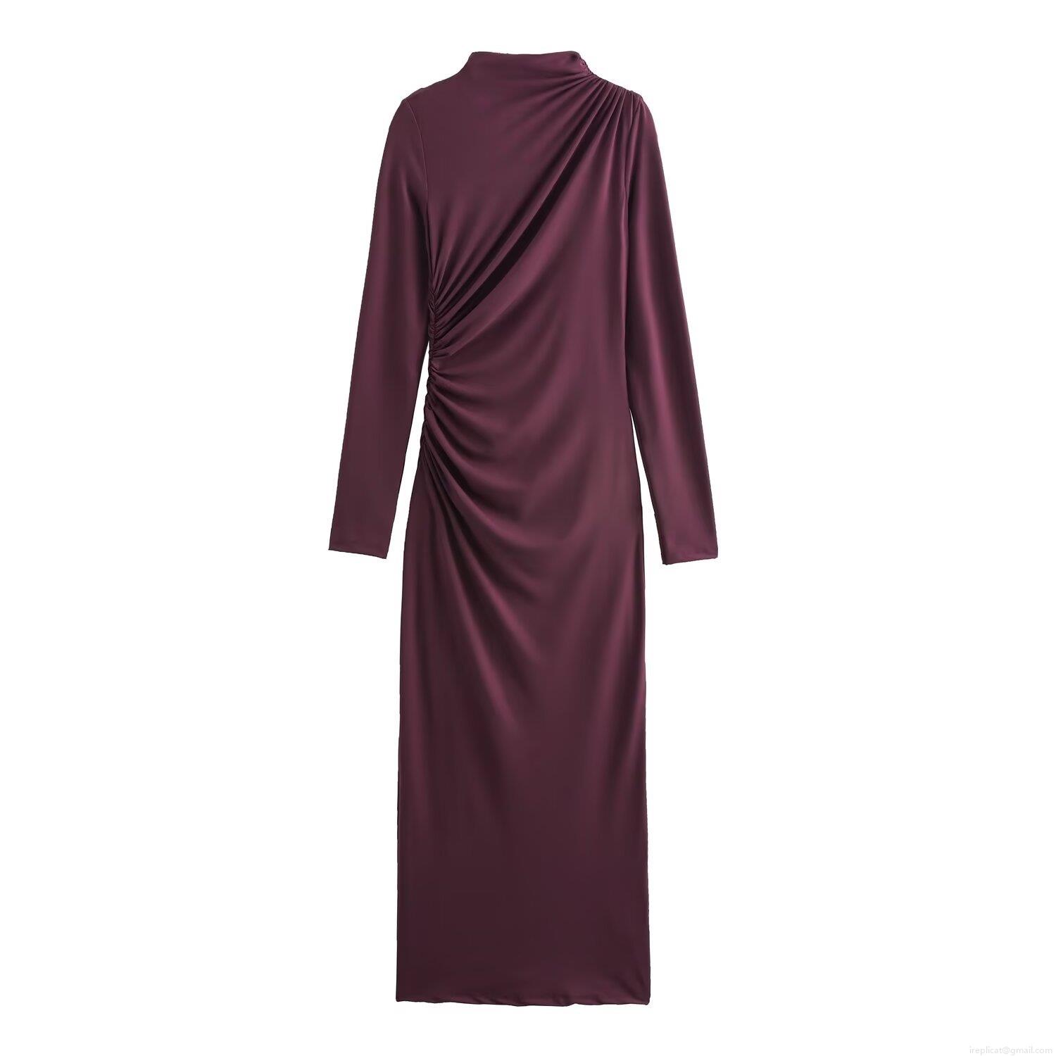 • Women's Stand Collar Ruched Maxi Dress Elegant Slim Fit Long Sleeve Bodycon Party Dress Solid Color Autumn Winter Polyester Midi Dress for Women