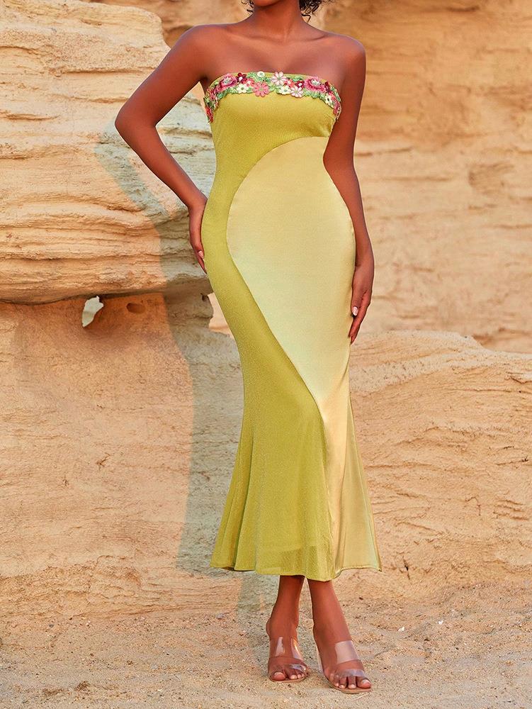 • Women's Strapless 3D Floral Embroidery Patchwork Maxi Dress Sexy Slim Fit Fish Tail Satin Long Dress for Summer Vacation Party 95% Polyester 5% Spandex