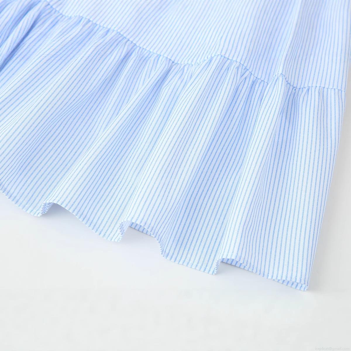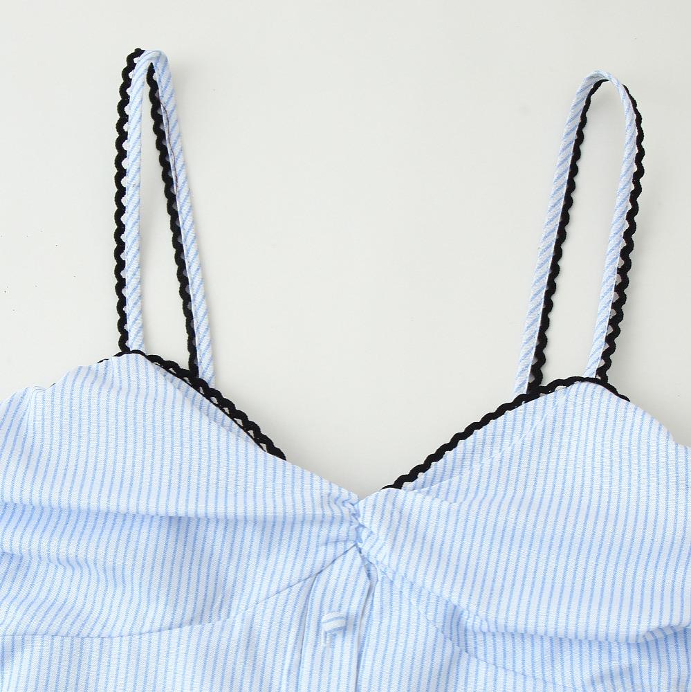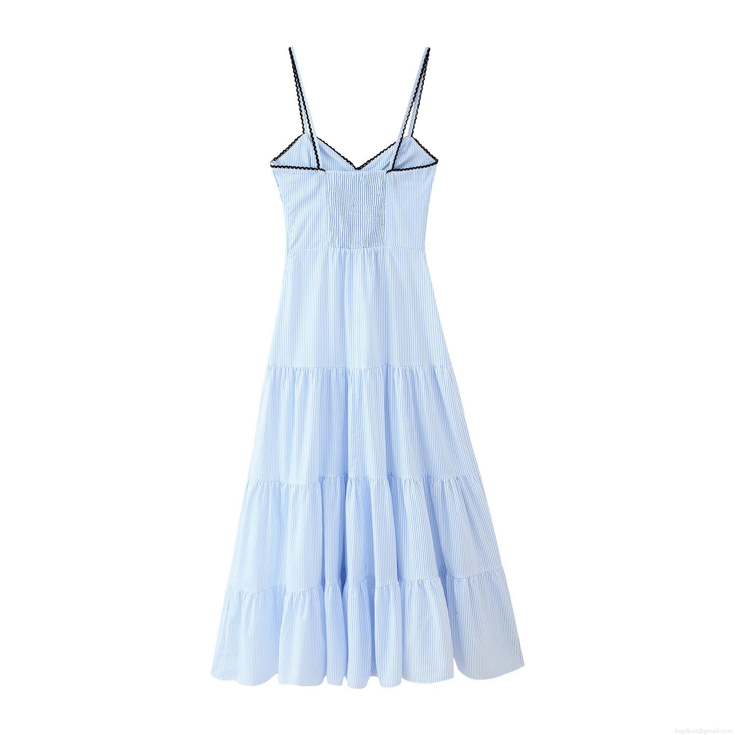 Vertical Stripes, V-neck, Gathering, Slab, Thin Straps, Multi-tiered Cake Skirt, Single-breasted Front