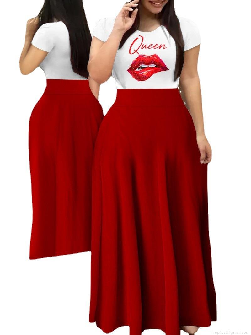• Women's Summer Casual 2 Piece Set Geometric Print Short Sleeve T-Shirt And High Waist Maxi Skirt A-Line Dress Bohemian Outfits Women Clothing