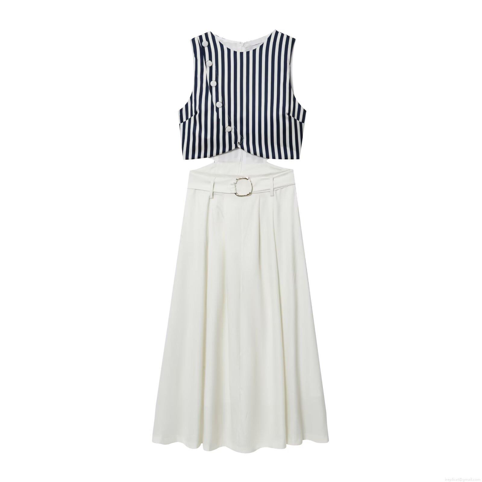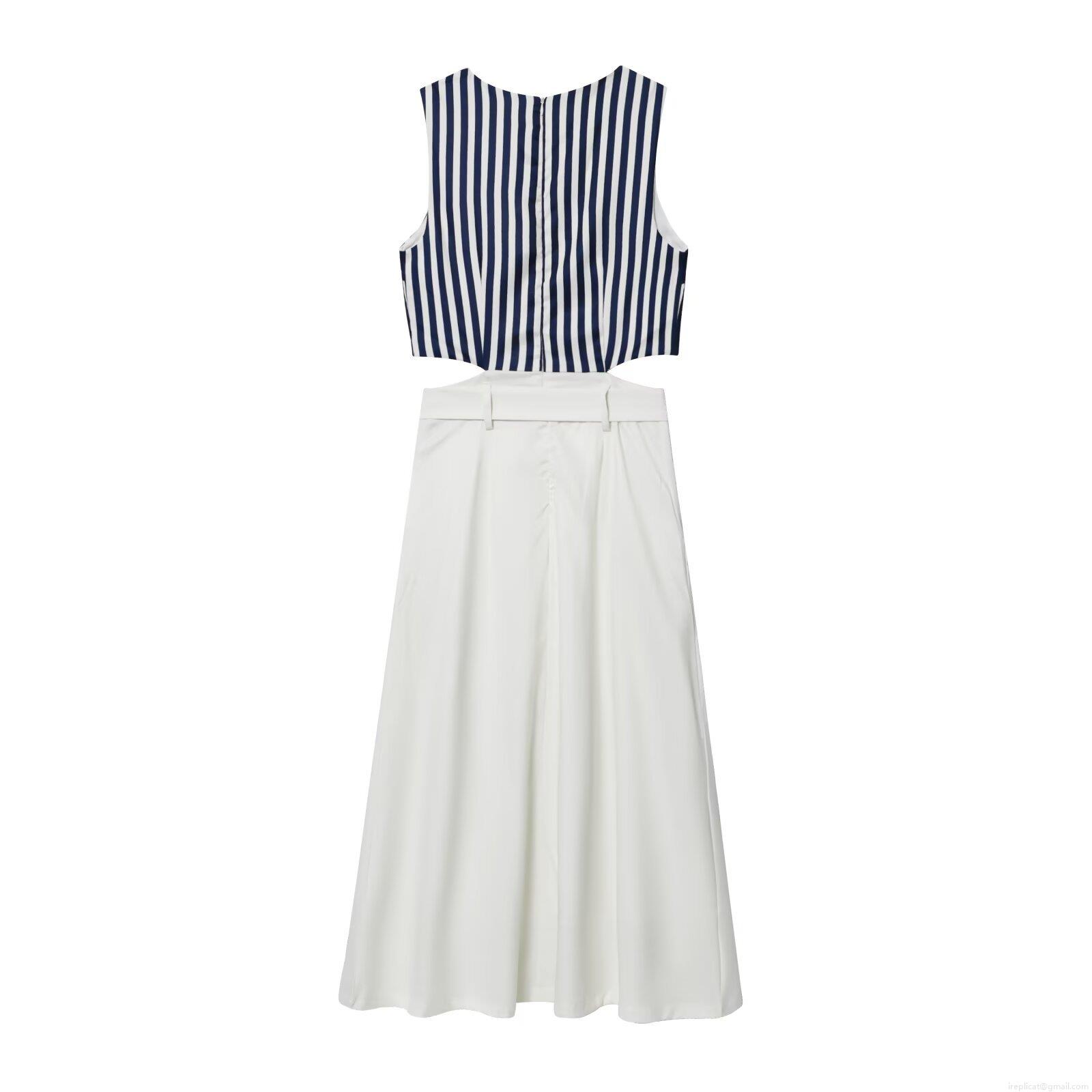 • Women's Summer Casual Striped Patchwork Maxi Dress Sleeveless Round Neck Waist Cut Out Long A-Line Dress With Belt For Vacation Daily Wear