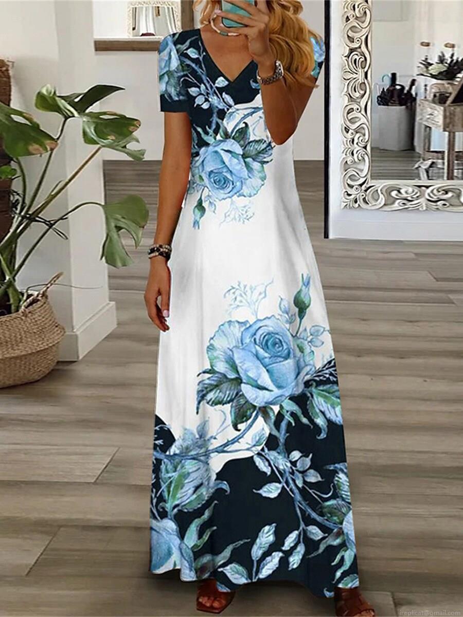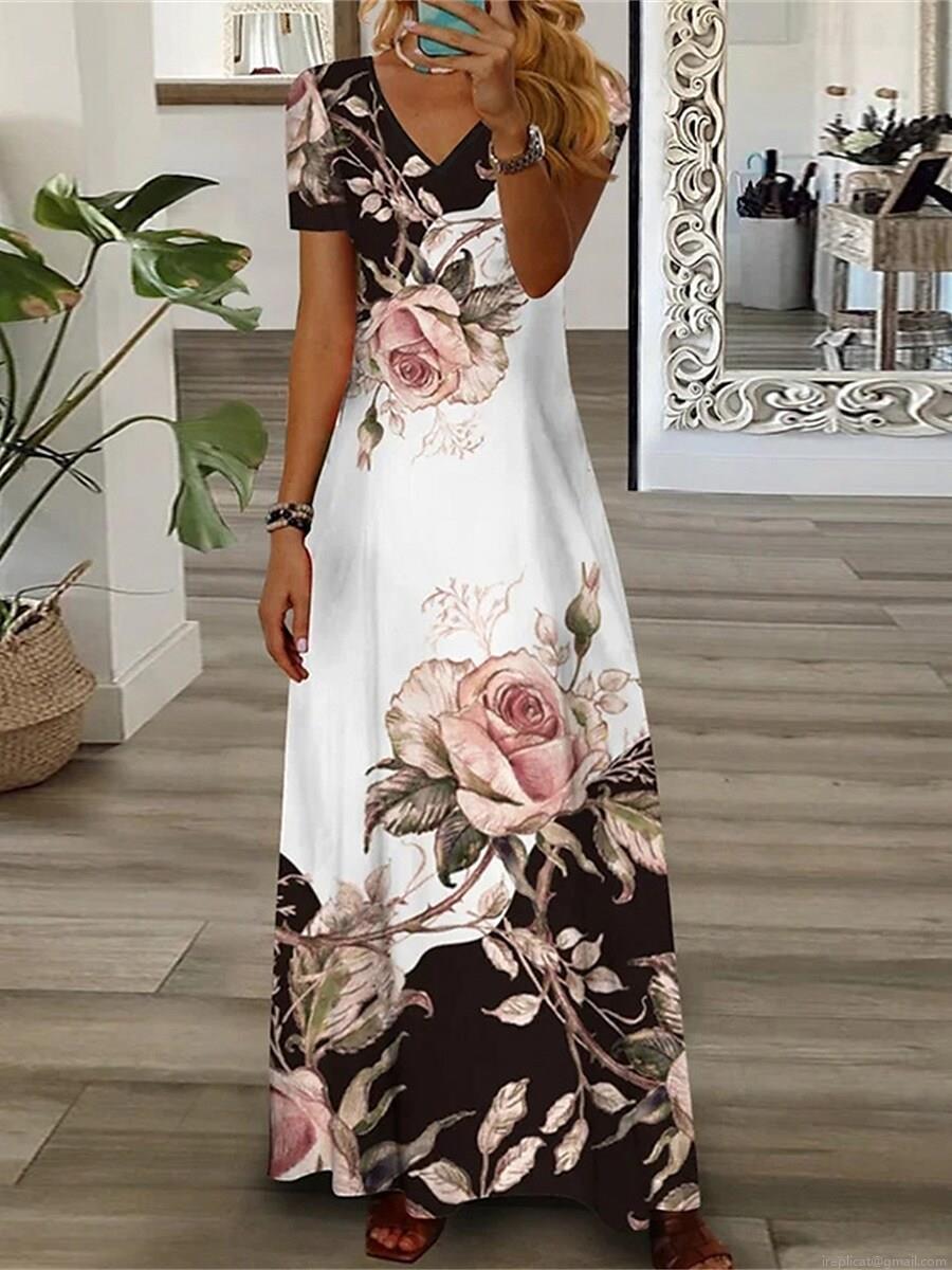 • Women's Summer Elegant V-Neck Short Sleeve Maxi Dress Polyester Spandex Blend Large Floral Rose Print A-Line Long Dress For Casual Daily Beach Vacation Bohemian Style