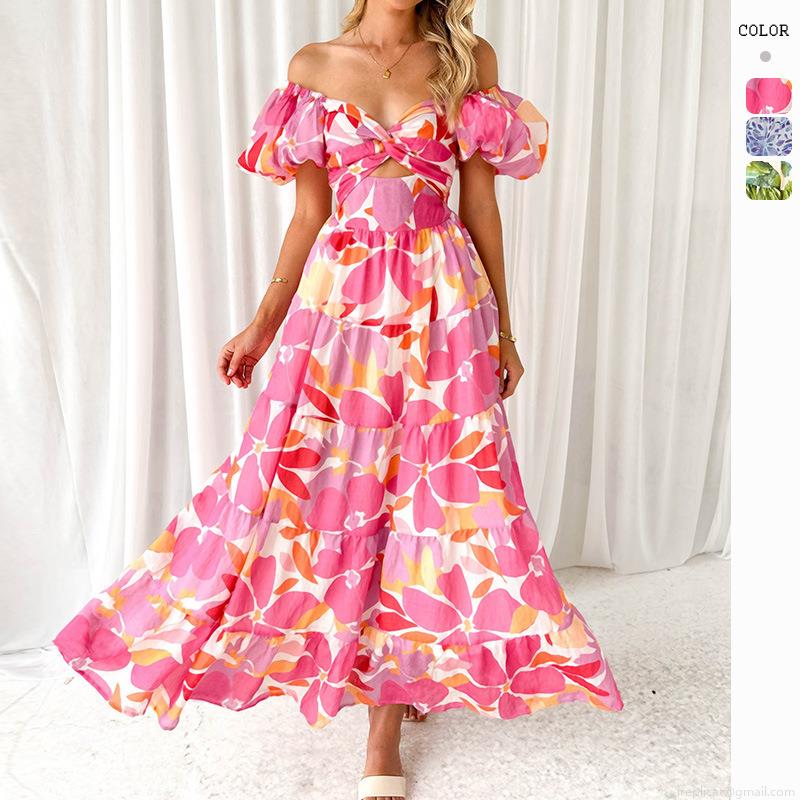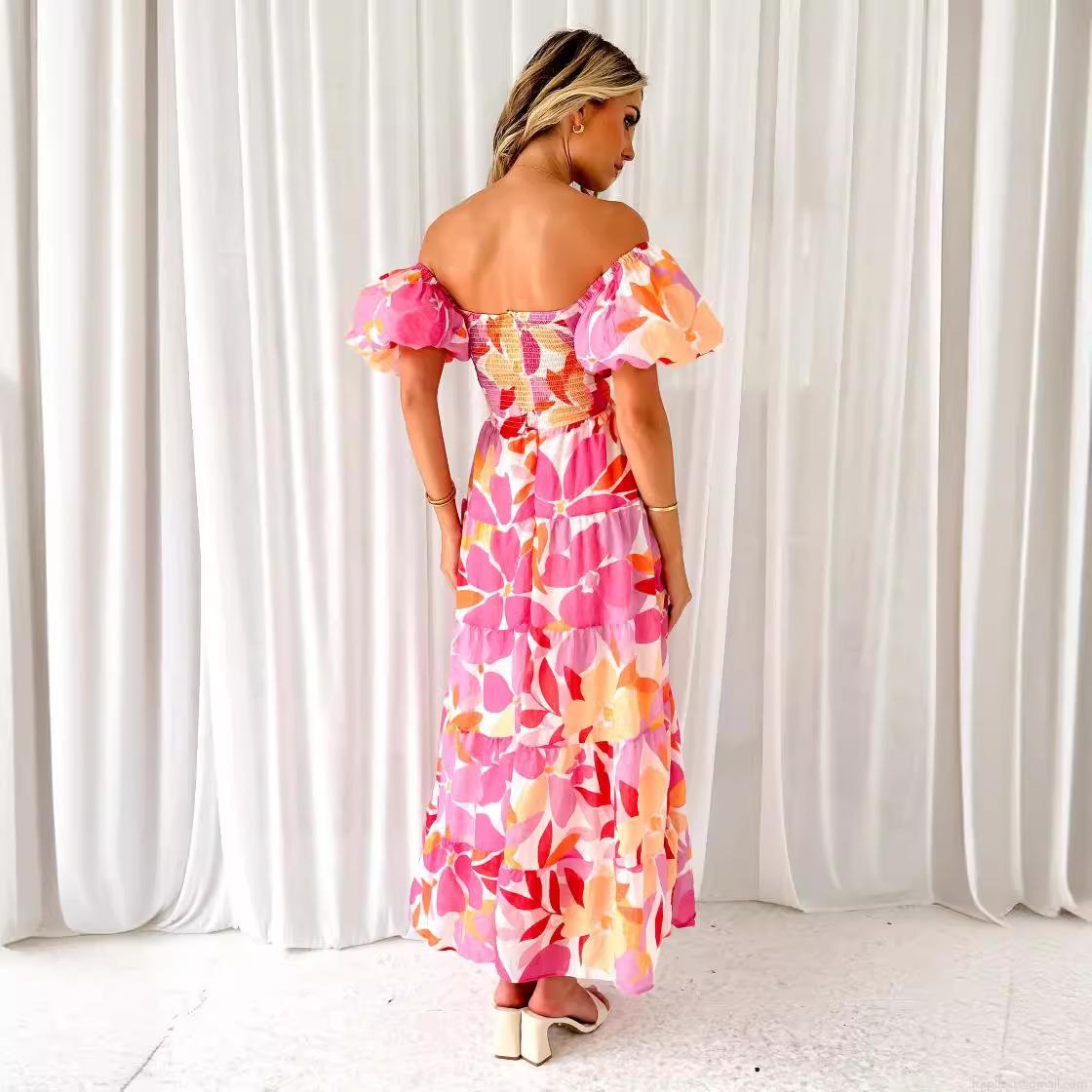 • Women's Summer Floral Print Maxi Dress Off Shoulder Puff Sleeve Hollow Out Waist Tiered Cake Skirt Polyester Resort Vacation Long Dresses