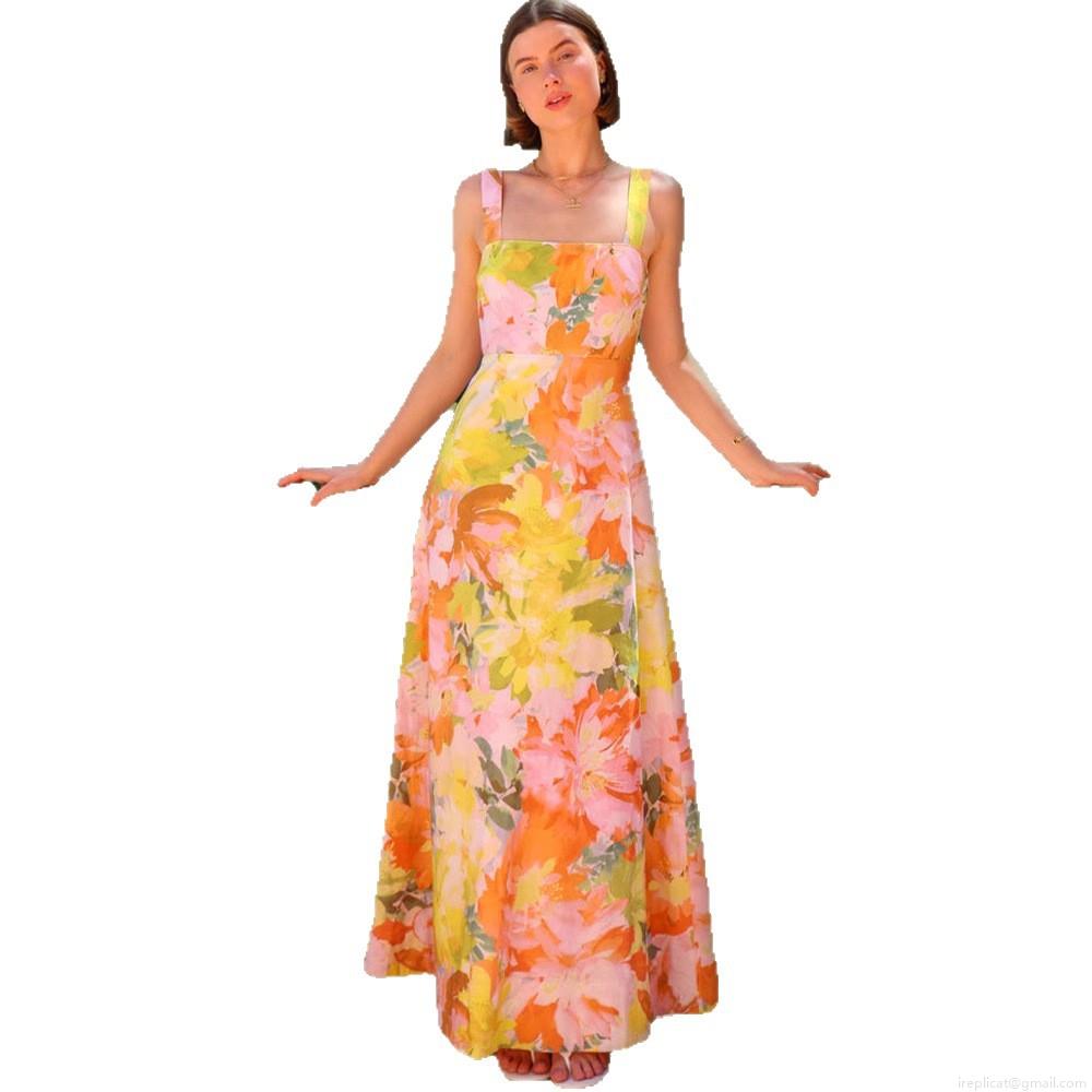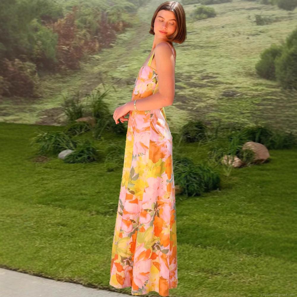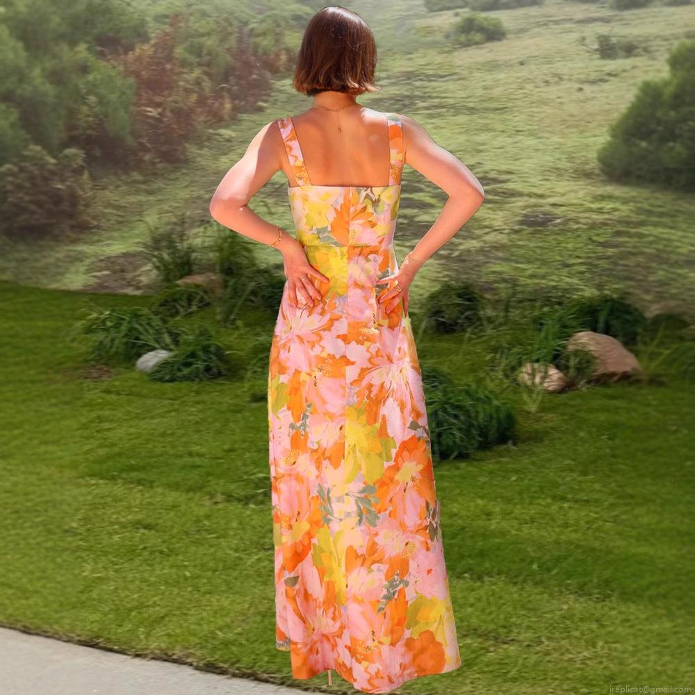 • Women's Summer Floral Print Maxi Dress Square Neck Sleeveless Sling Backless Holiday A-Line Long Dress For Women Beach Party Sexy Streetwear