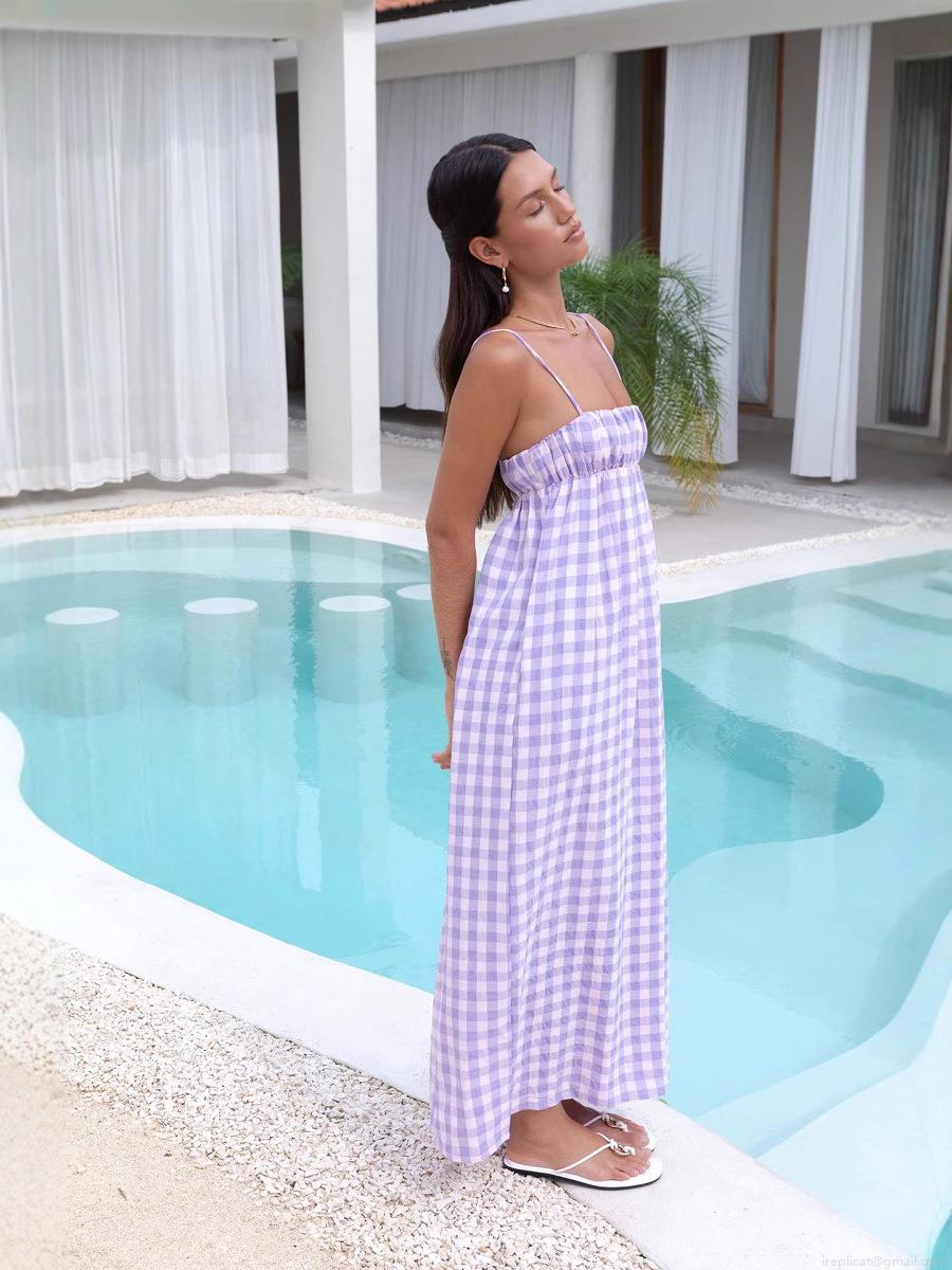 • Women's Summer Gingham Slip Maxi Dress Casual Polyester Sleeveless High Waist A-Line Long Dress With Pockets Purple White Plaid Resort Vacation Beachwear