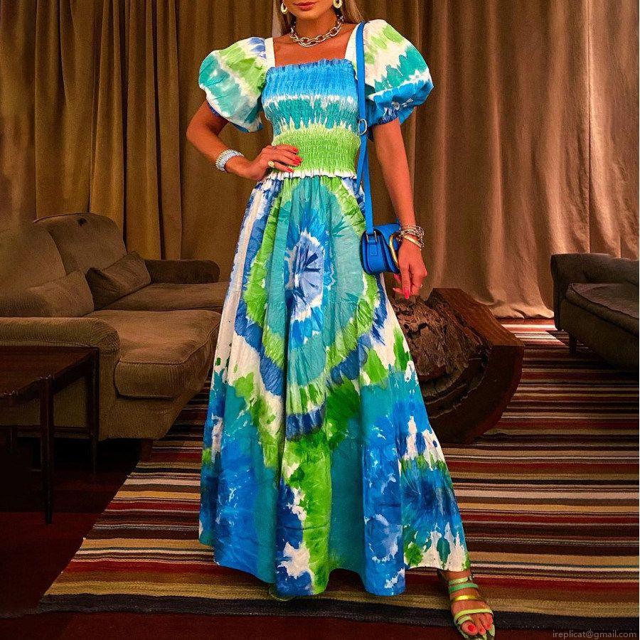• Women's Summer Maxi Dress Polyester Spandex Blend Tie-Dye Print Off-Shoulder Bubble Sleeve Smocked High Waist Boho Long Beach Sundress