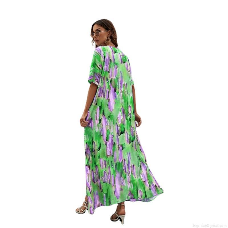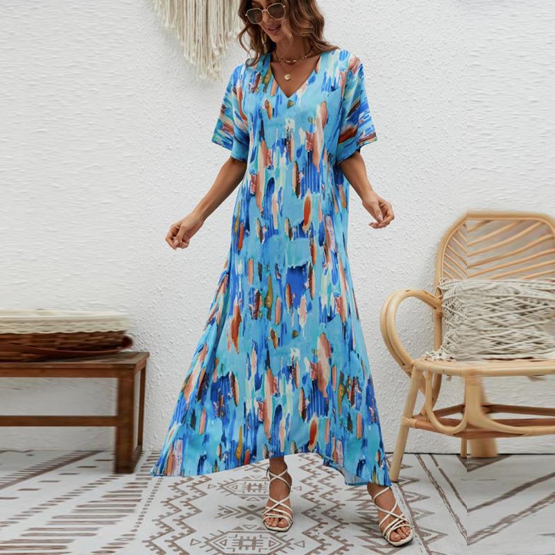 • Women's Summer Maxi Dress Polyester V-Neck Abstract Print Loose Short Sleeve Bohemian Style Beach Vacation Long Dresses