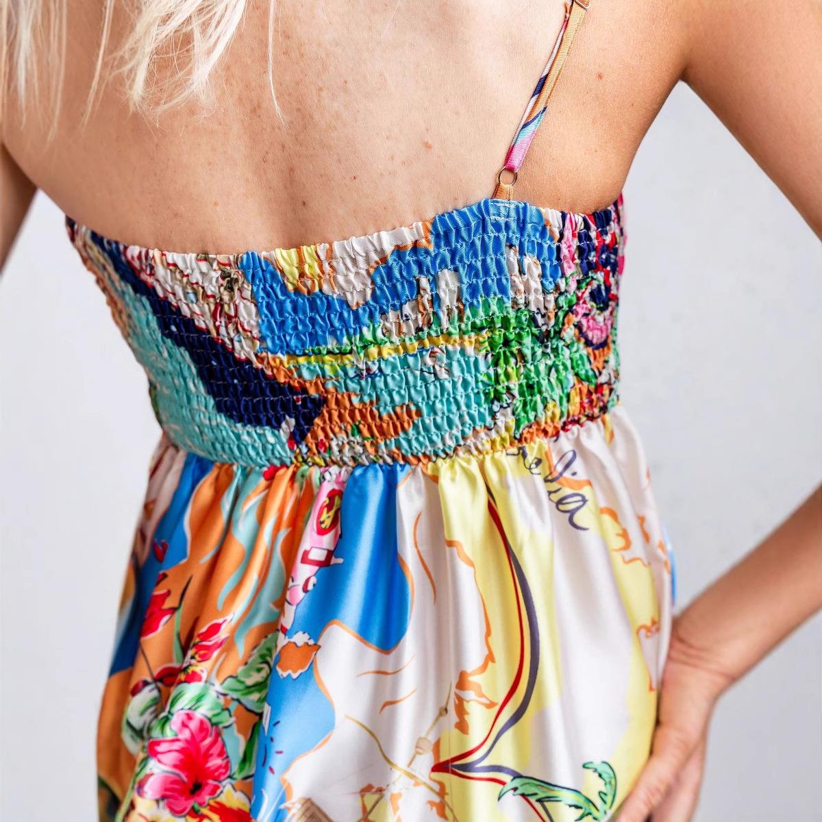 • Women's Summer Maxi Dress Spaghetti Strap Backless Smocked High Waist Oceania Map Floral Print Bohemian Sexy Satin-like Beach Holiday Long Dress