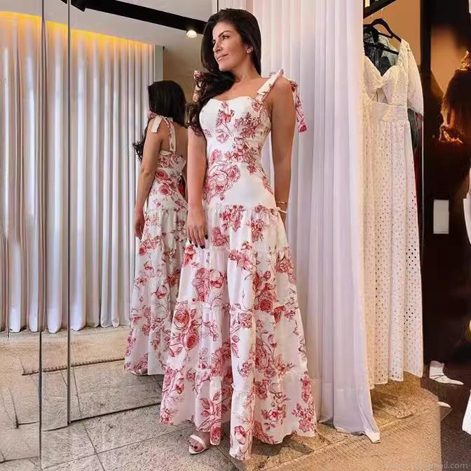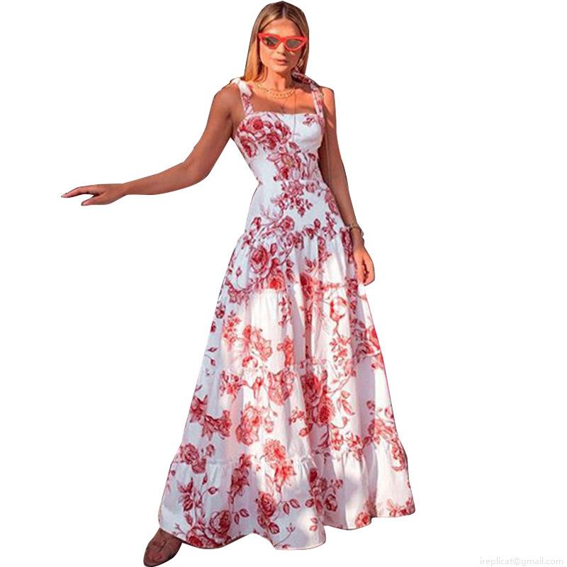 • Women's Summer Rose Print Sling Maxi Dress Bohemian Floral Tiered Cake Skirt Holiday Beach Sleeveless Square Neck Long Dress