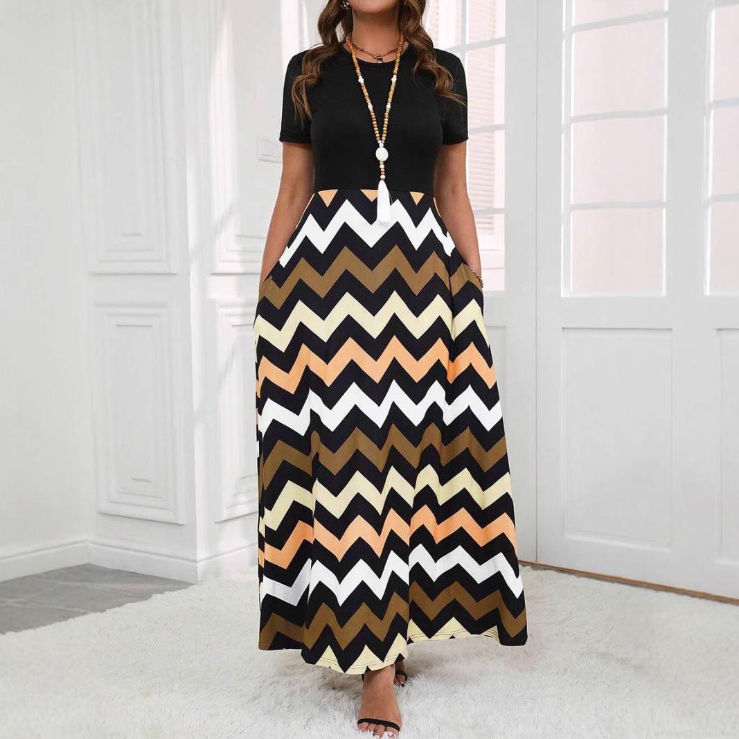 • Women's Summer Short Sleeve Patchwork Maxi Dress Casual Round Neck A-Line Chevron Printed Long Dress With Pockets Polyester Spandex Outfit