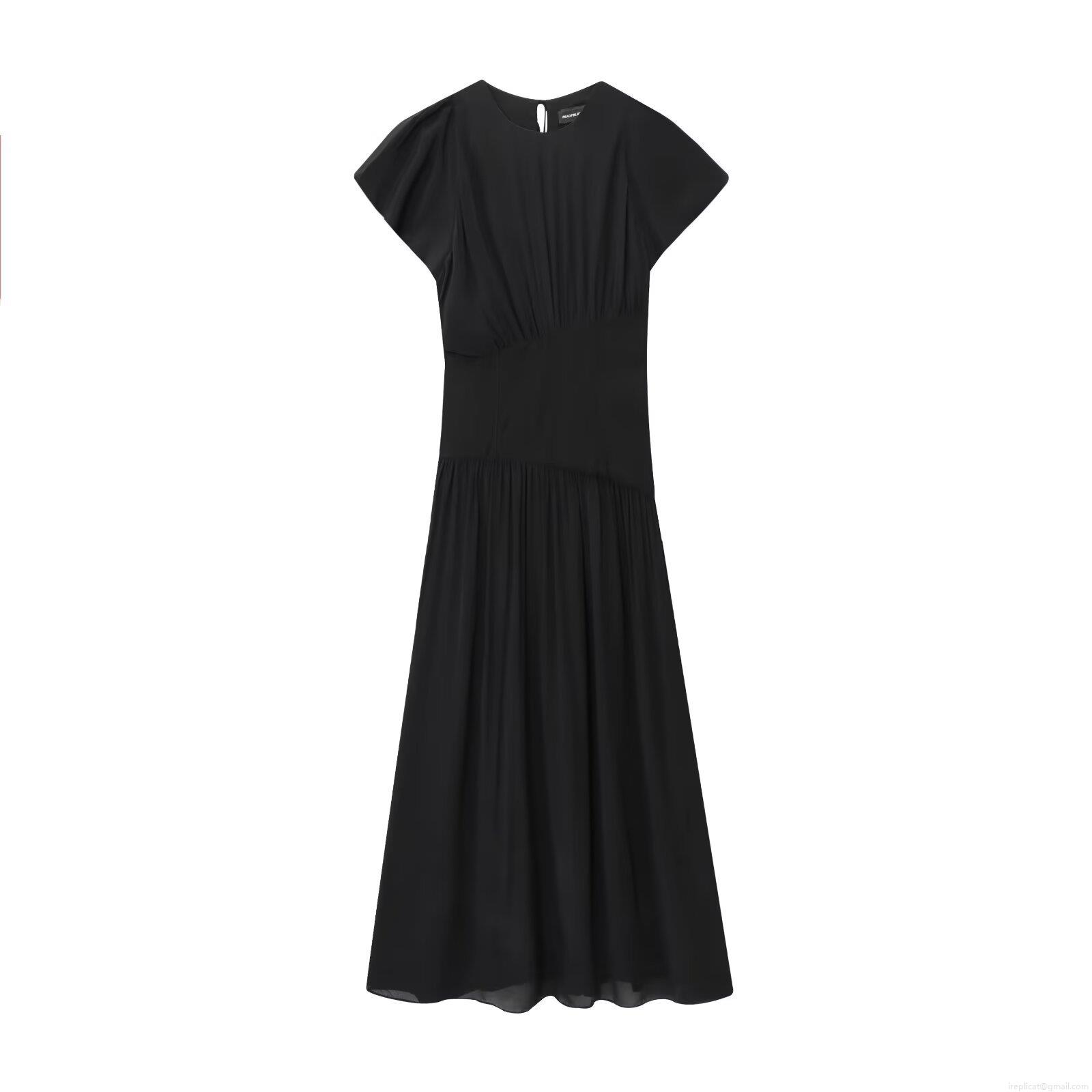Women's Summer Short Sleeve Round Neck Solid Color Polyester Maxi Dress With Cinching Waist And Pleated Skirt For Casual Streetwear Daily Wear