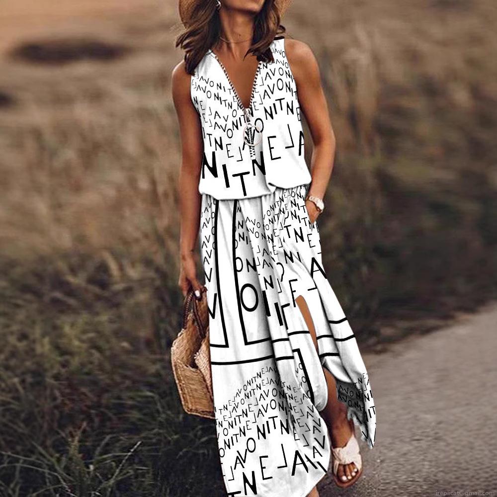 • Women's Summer Sleeveless Maxi Dress V-Neck Zipper Side Slit Letter Print Polyester Spandex Casual Streetwear Dress For Ladies