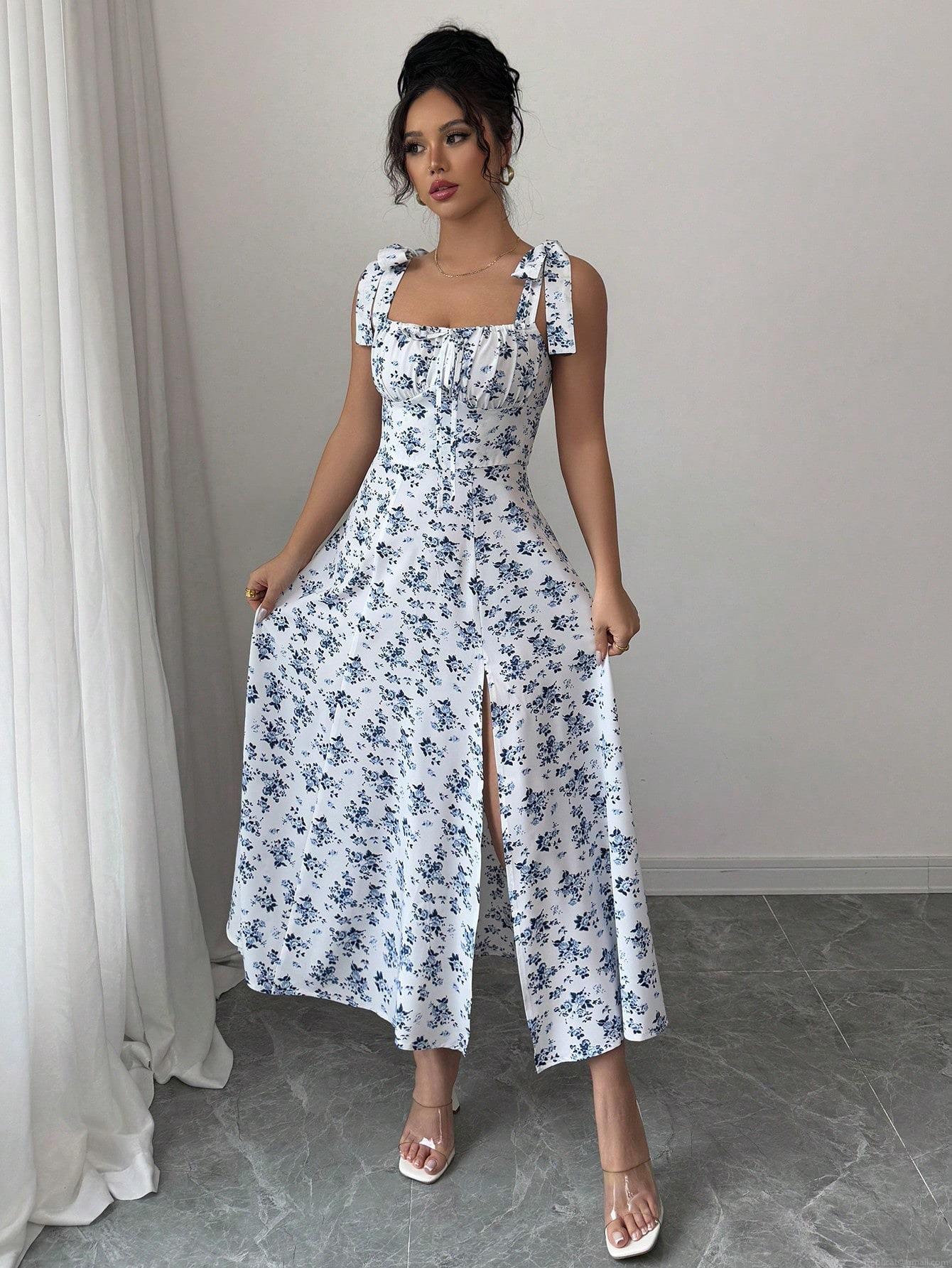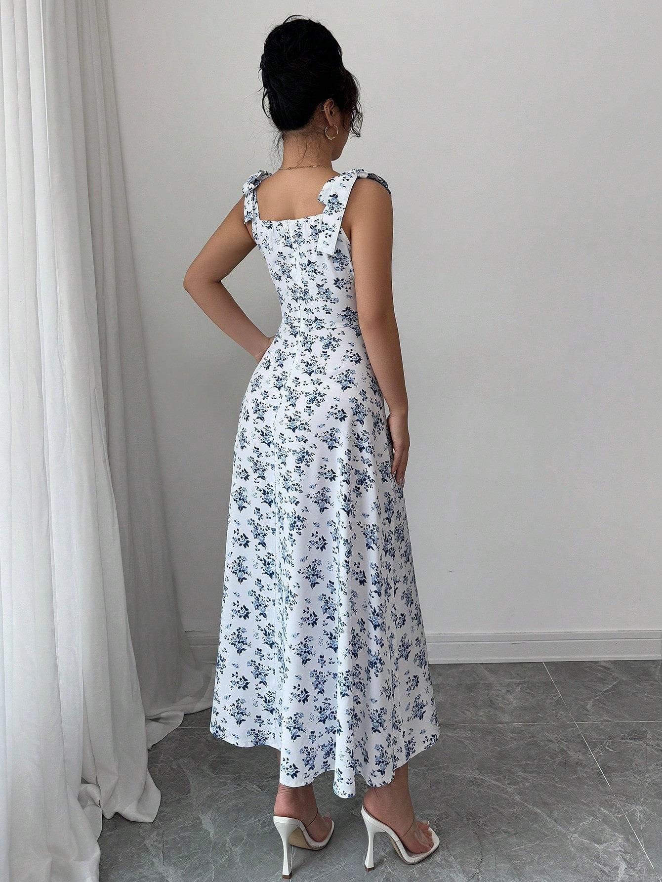 • Women's Summer Sweet Blue Floral Maxi Dress With Bow-tie Spaghetti Strap Square Neck High Slit Polyester Spandex Long Dress For Vacation Beach Wear