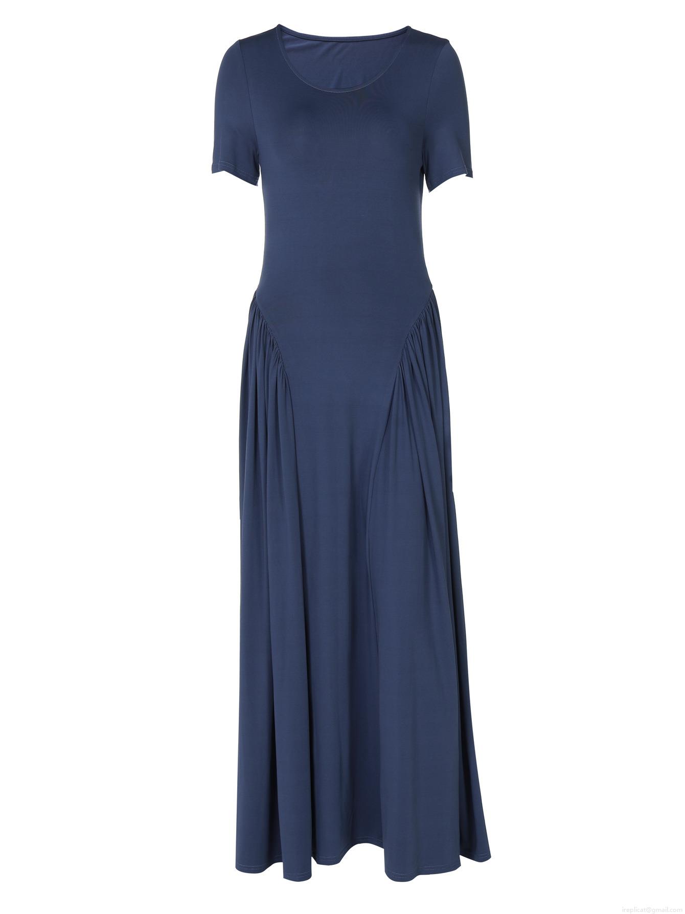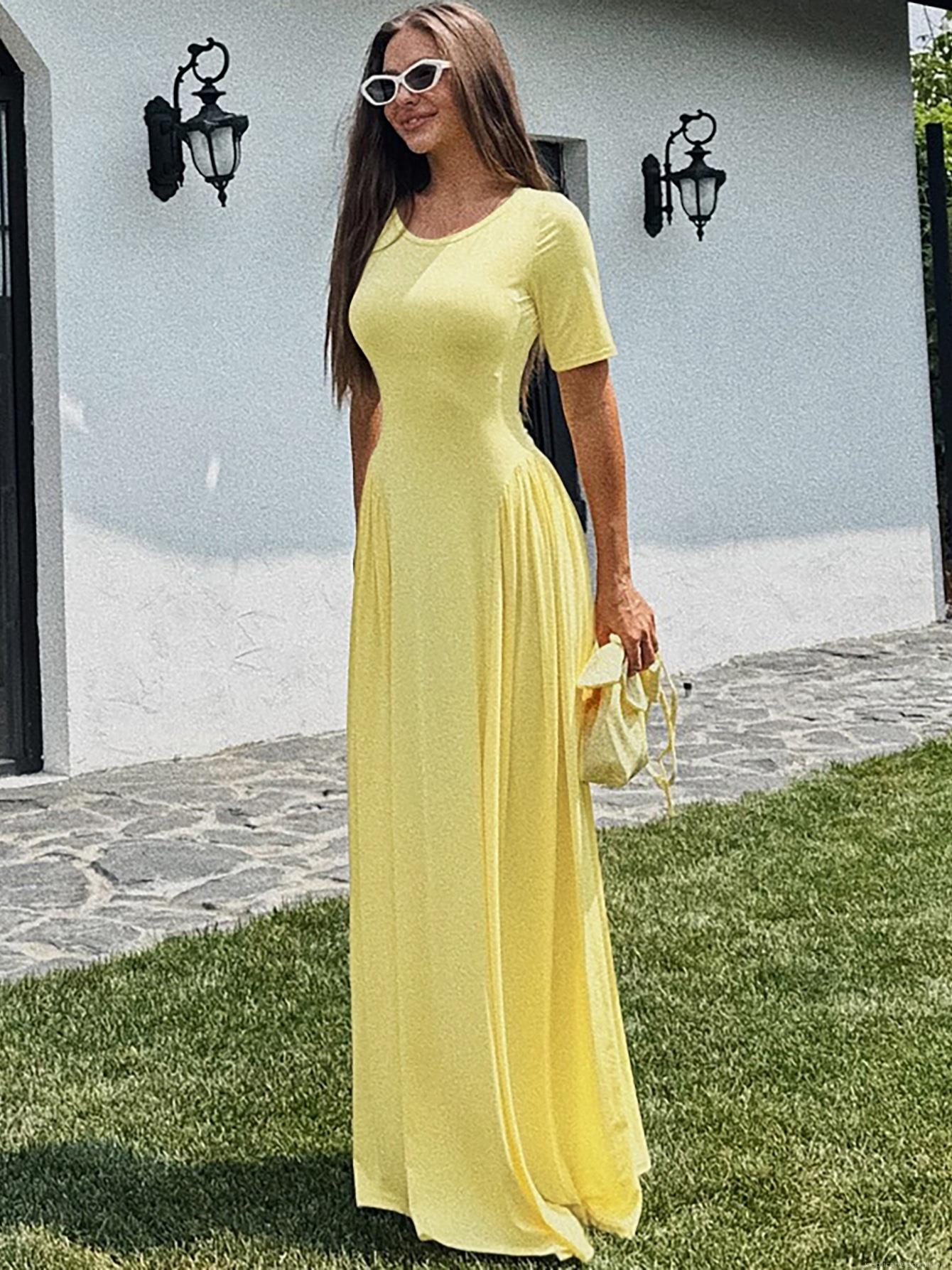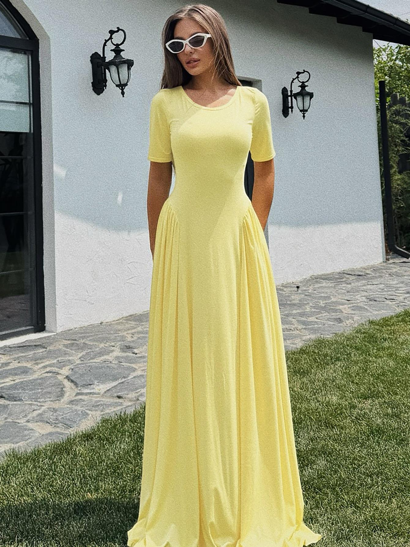 • Women's Summer U-Neck Short Sleeve Maxi Dress Polyester Spandex Ruched Slim Fit Solid Color Swing Long Sun Dress for Casual Vacation Party