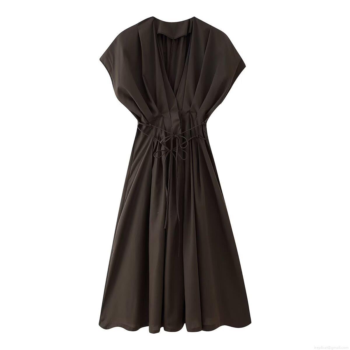 • Women's Summer V-Neck Cap Sleeve Maxi Dress Pleated Waist Tie Solid Color Polyester A-Line Gown European Style Casual Party Evening Long Dress