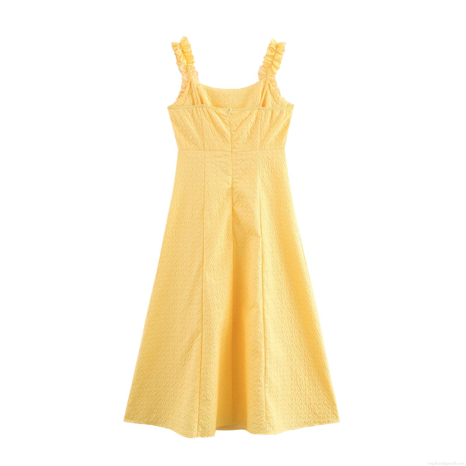 • Women's Summer Yellow Ruffle Strap Maxi Dress Polyester Jacquard Textured High Waist A-Line Long Dress For Vacation Party Sweet Elegant Style