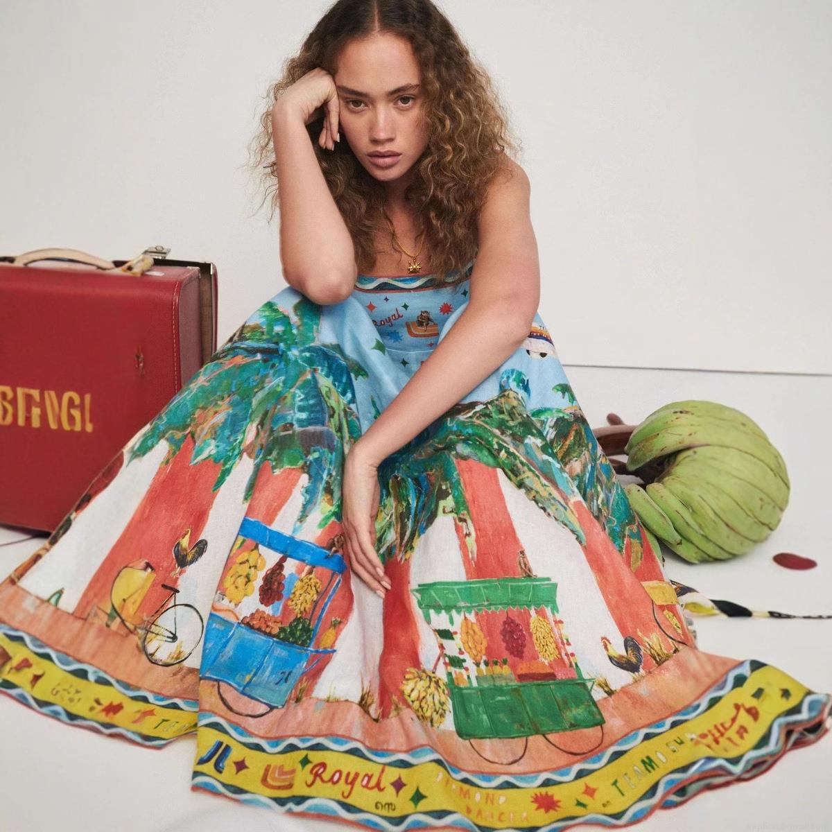 Tropical Plants, Flowers, Fruit, Coconut Trees, Suspenders, All-over Print, Full Skirt