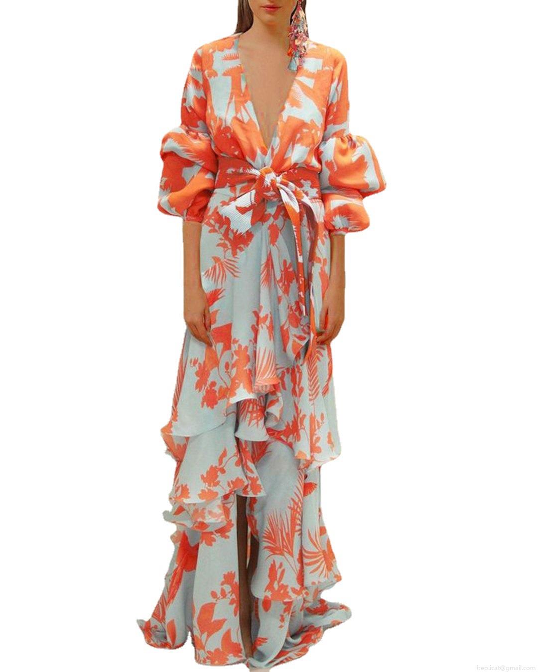 • Women's V Neck Boho Floral Maxi Dress Lantern Sleeve Ruffle Hem A-Line Chiffon Vacation Beach Long Dresses For Summer Holiday Party