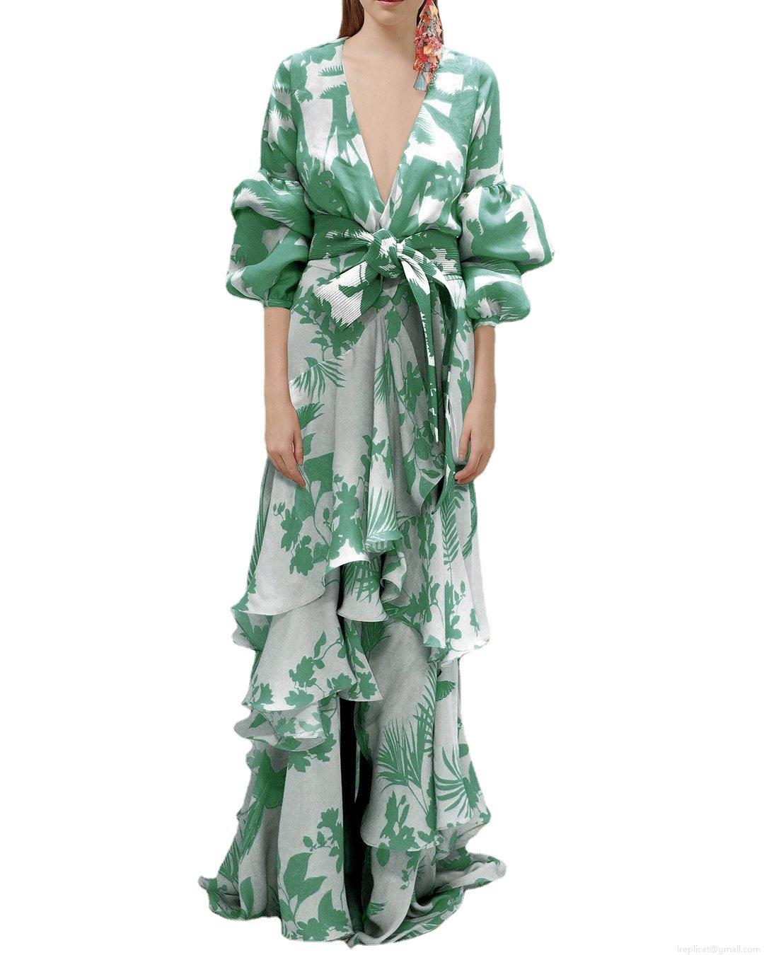 Ruffles, Flowers, Lantern Sleeves, Deep V-neck, Waist Tie, Tropical Plant Prints