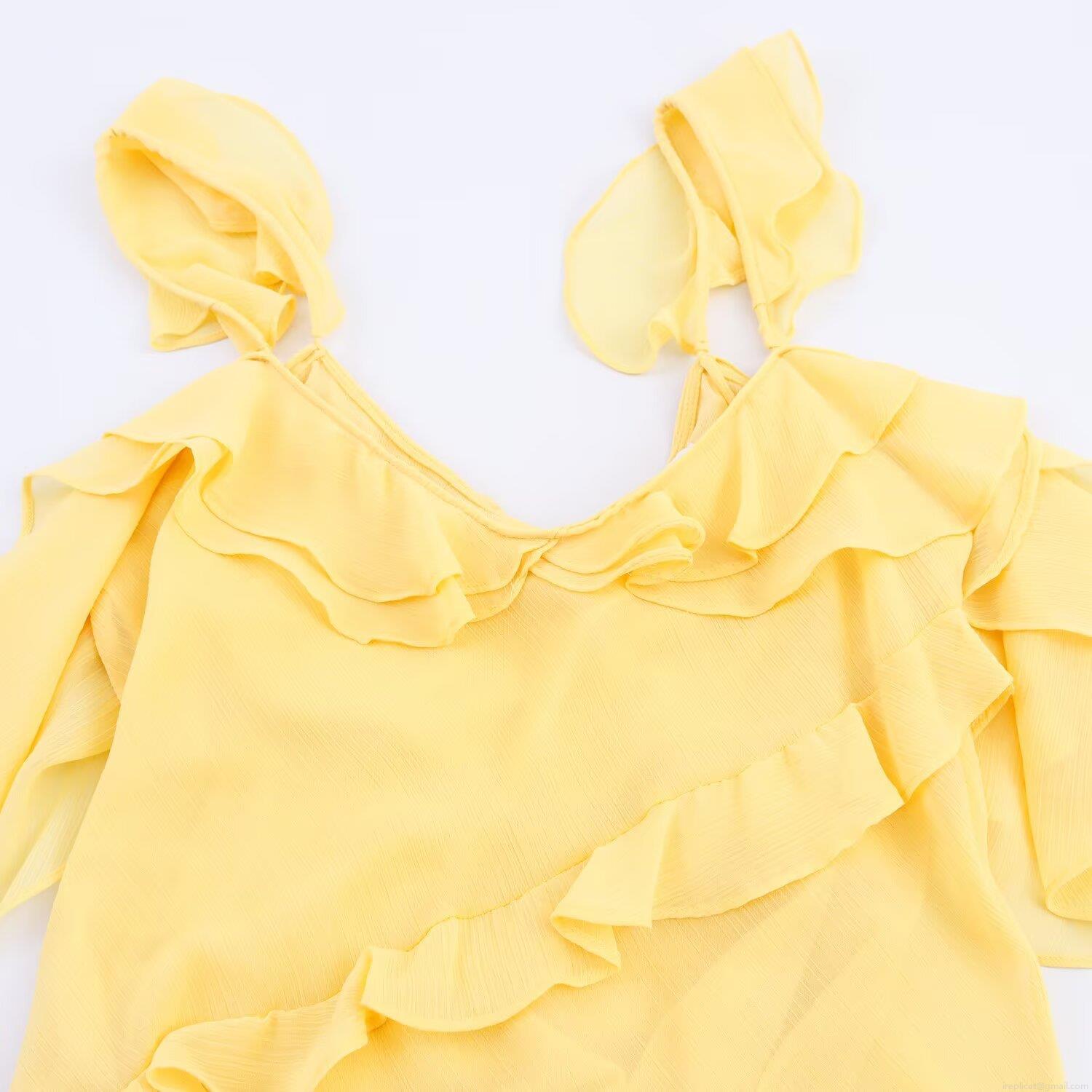 Solid Color, V-neck, Off-shoulder, Multi-layered Ruffles, Splicing And Stacking
