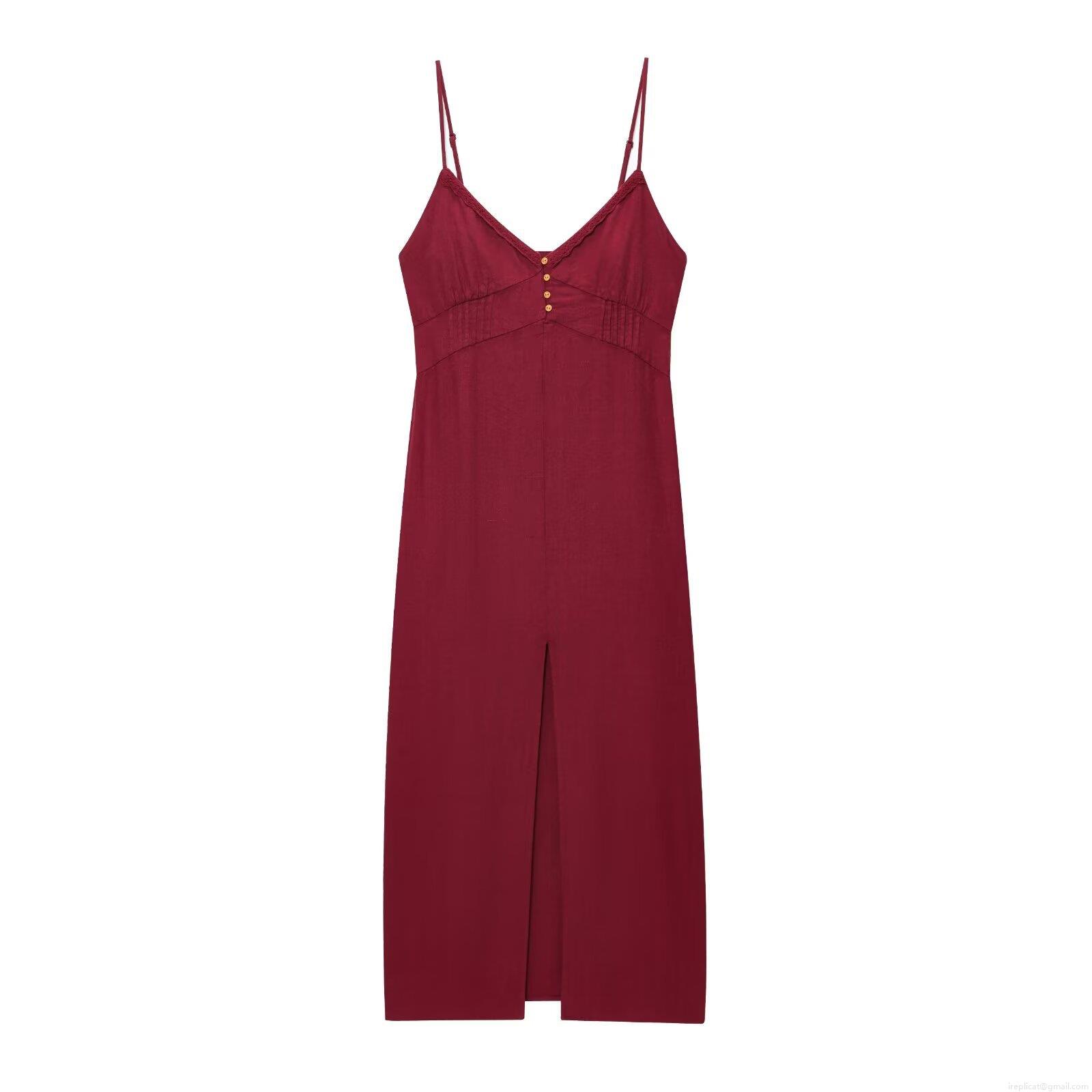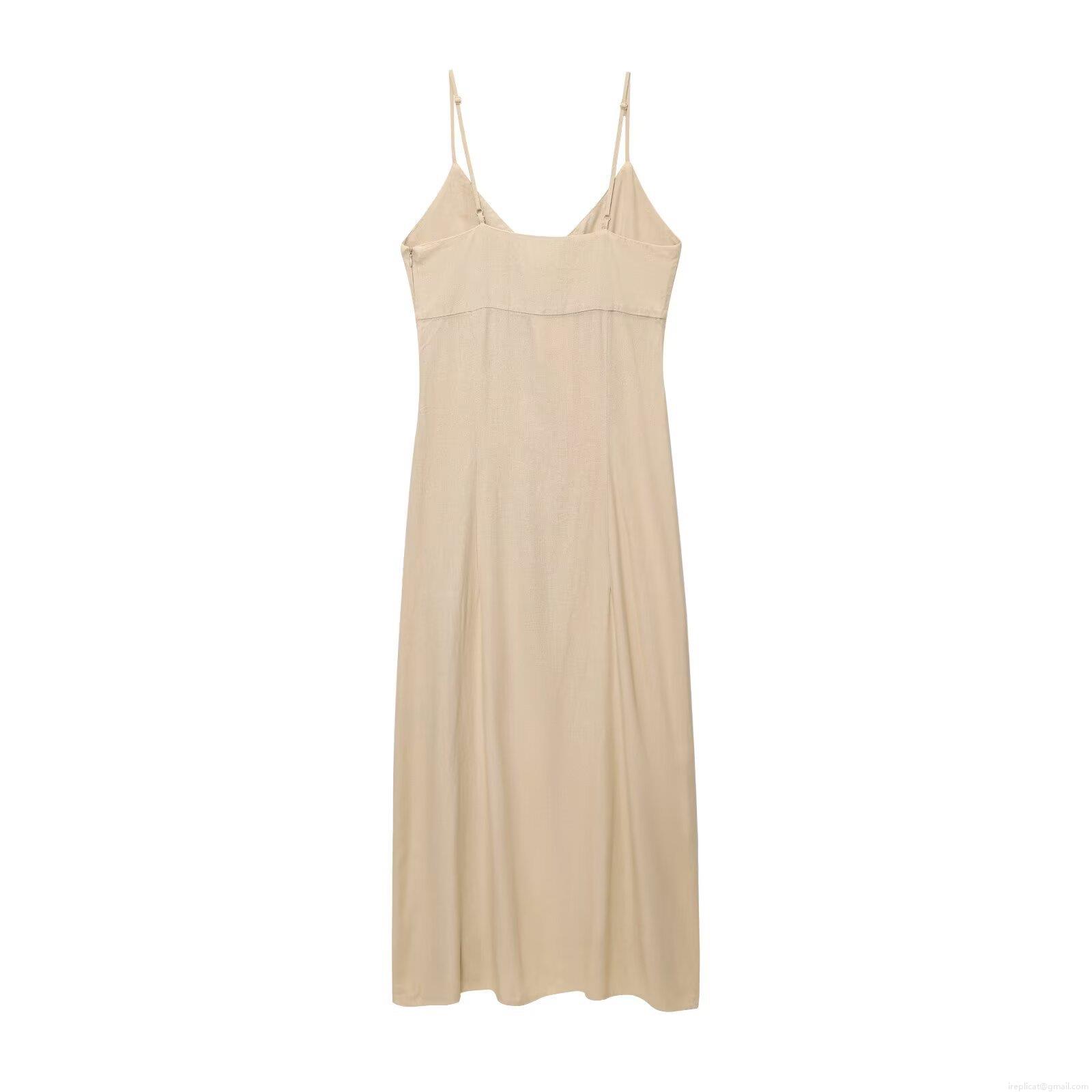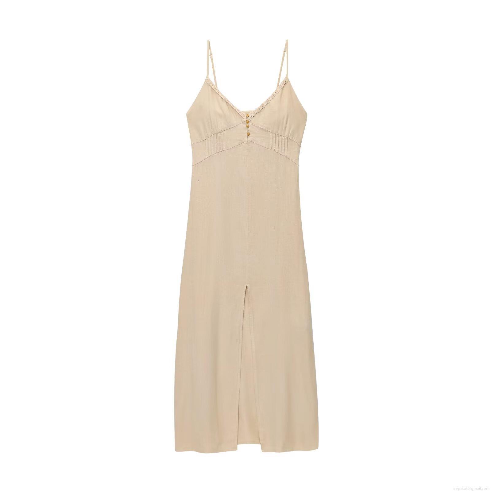 • Women's V Neck Cotton Linen Blend Camisole Midi Dress Summer Casual Vacation Lace Trim Single Breasted Front Slit Sleeveless Long Dress