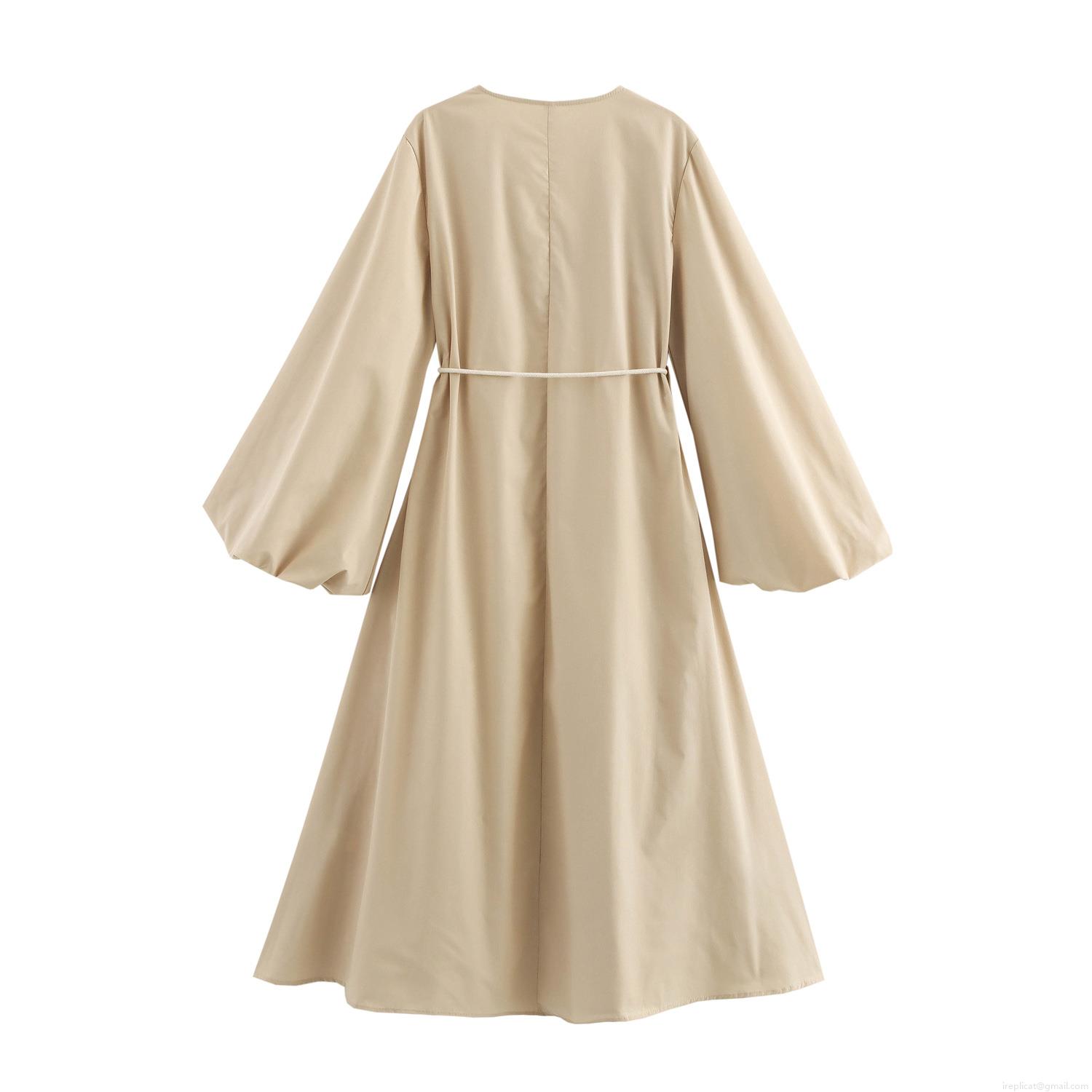 Solid Color, Embroidery, V-neck, Lantern Sleeves, Palm Tree Embroidery, Beaded Belt