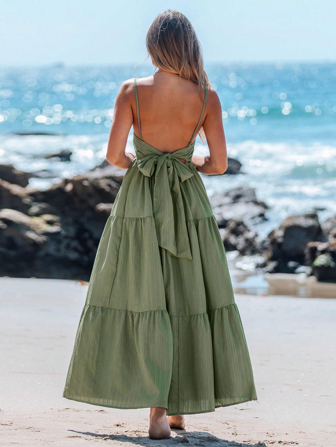 • Women's Vacation Maxi Dress 100% Polyester Backless Lace-up Tiered Beach Sun Dress Bohemian Solid Color Green Long Dress for Summer Women