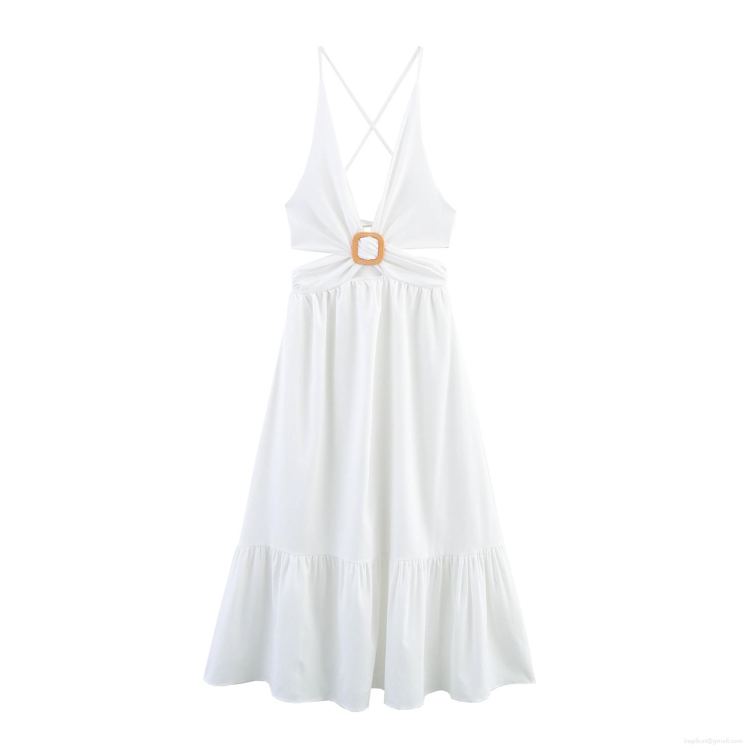 Cross Straps, Ruffled Splicing, Open Back, Woven Button Decoration