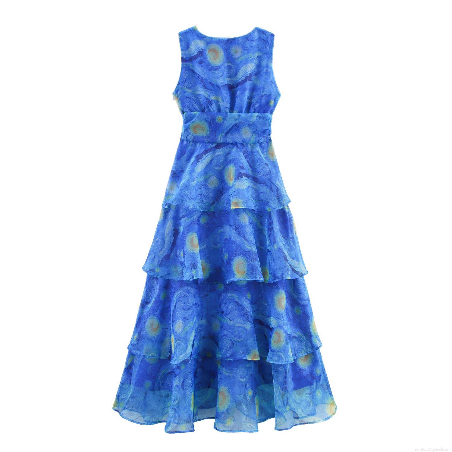 • Women's Van Gogh Starry Night Print Sleeveless V-Neck Maxi Dress Elegant Chiffon Ruffle Layered Tiered Cake Dress For Party Vacation Summer