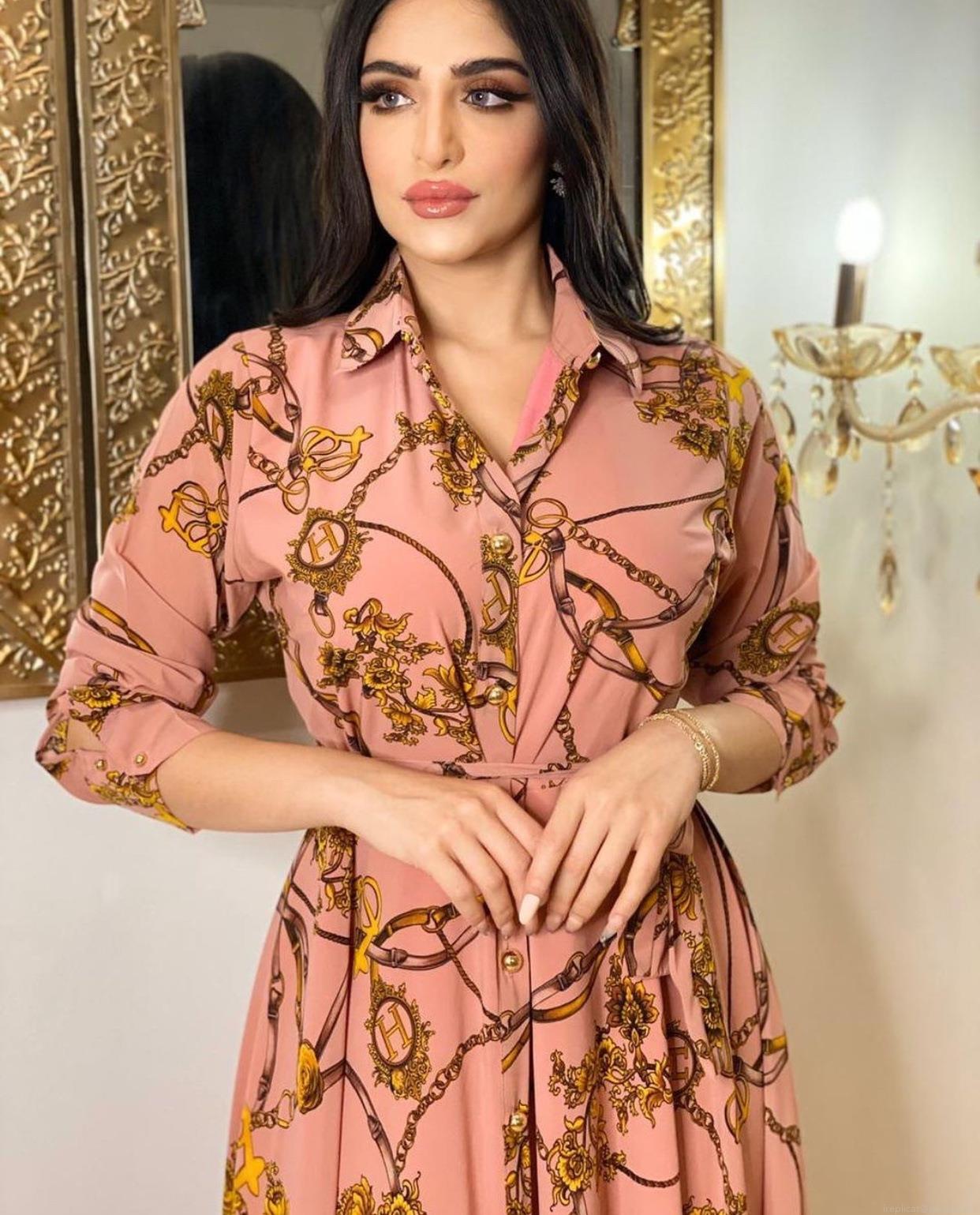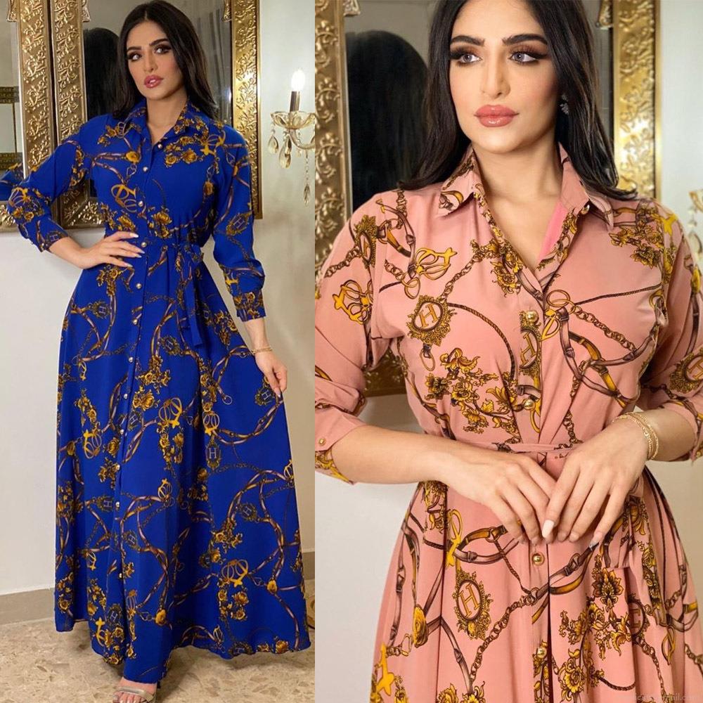 • Women's Vintage Chain Print Satin Maxi Dress Elegant Long Sleeve Belted Shirt Dress Long Swing Evening Party Gown With Buttons