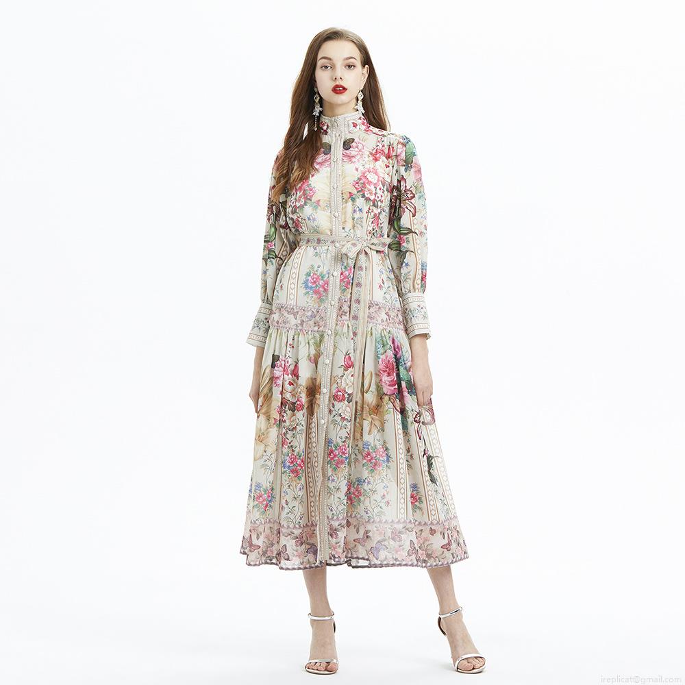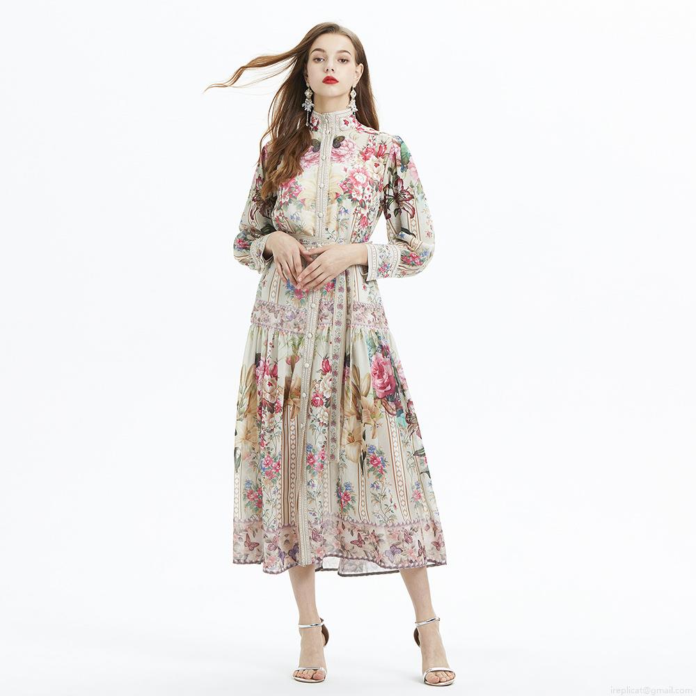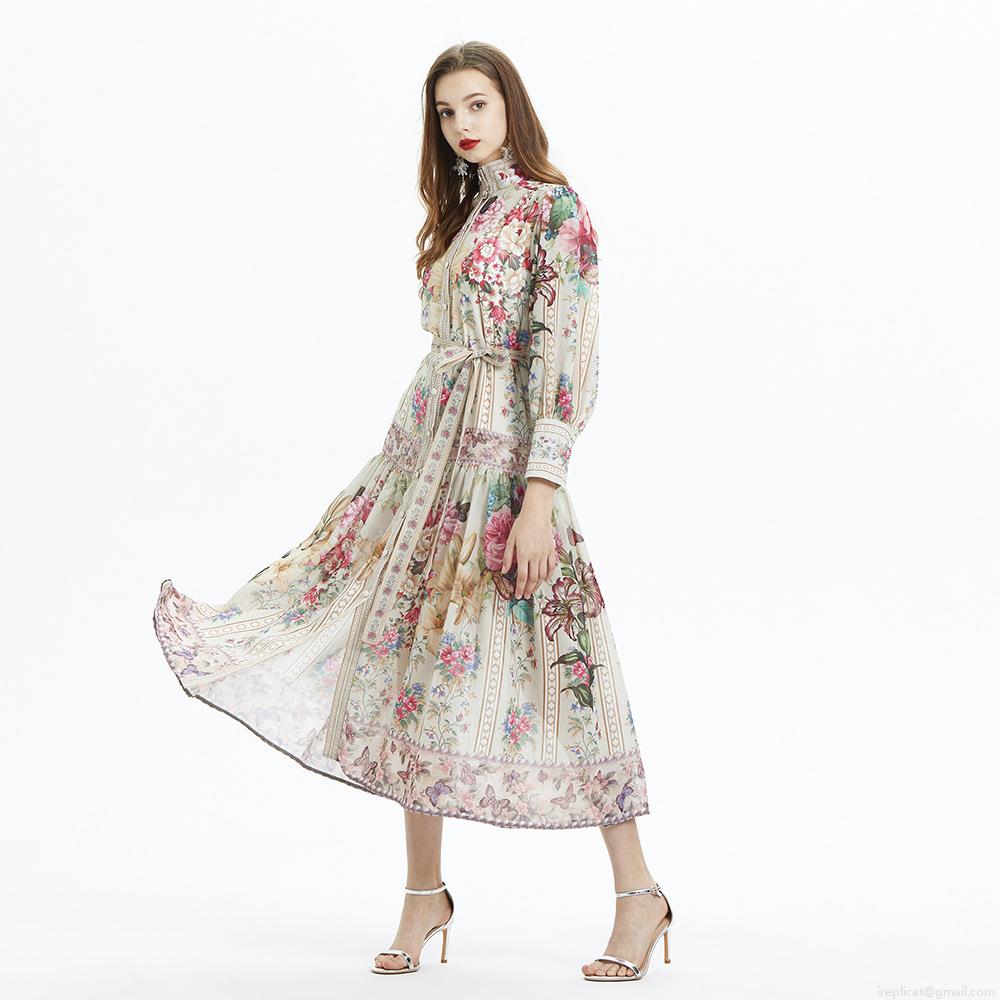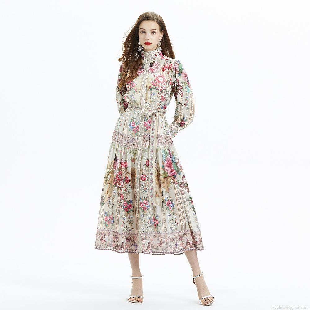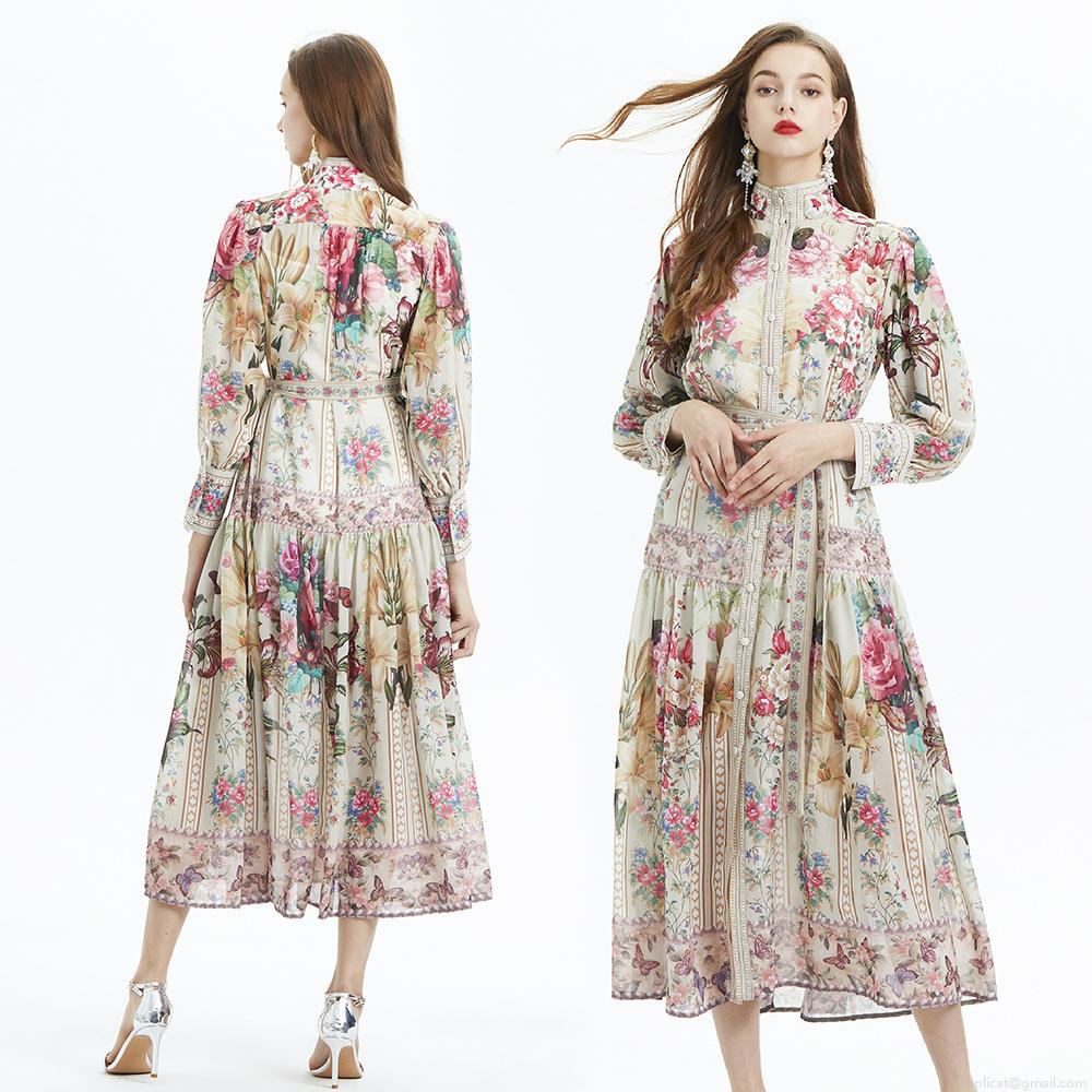 Women's Vintage Court Style Chiffon Floral Maxi Dress Lantern Sleeve High Neck Ruffle Two-Piece Set Elegant Boho Butterfly Print Dress With Belt
