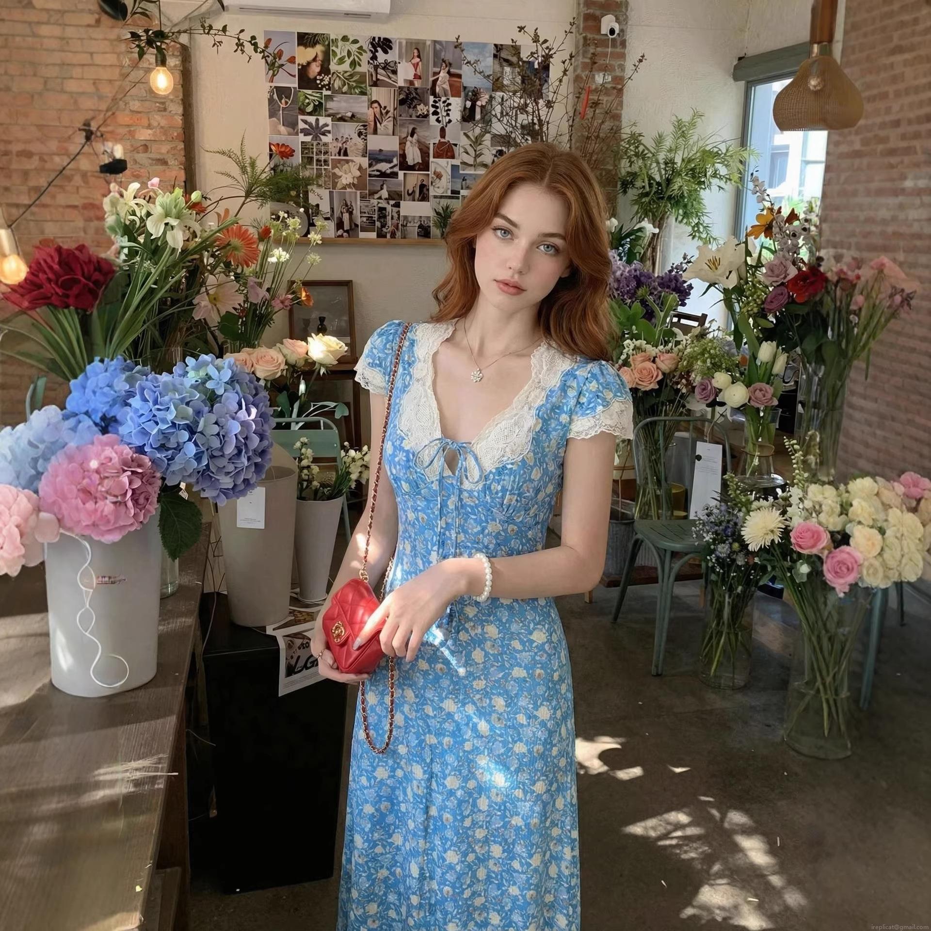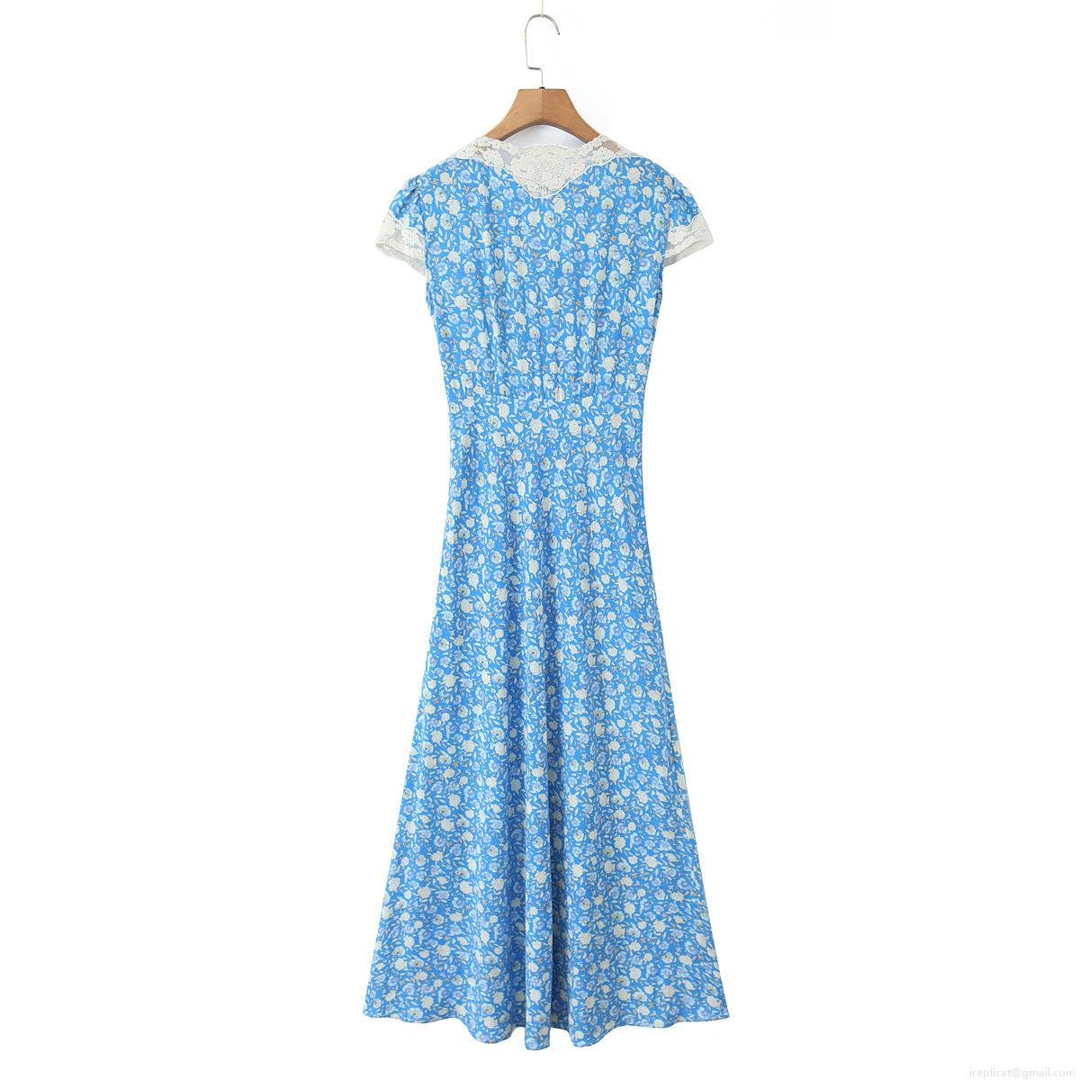 • Women's Vintage Floral Maxi Dress V-Neck Lace Patchwork Short Sleeve Summer Boho Beach Long Dress With Bow Tie