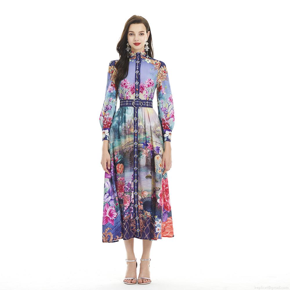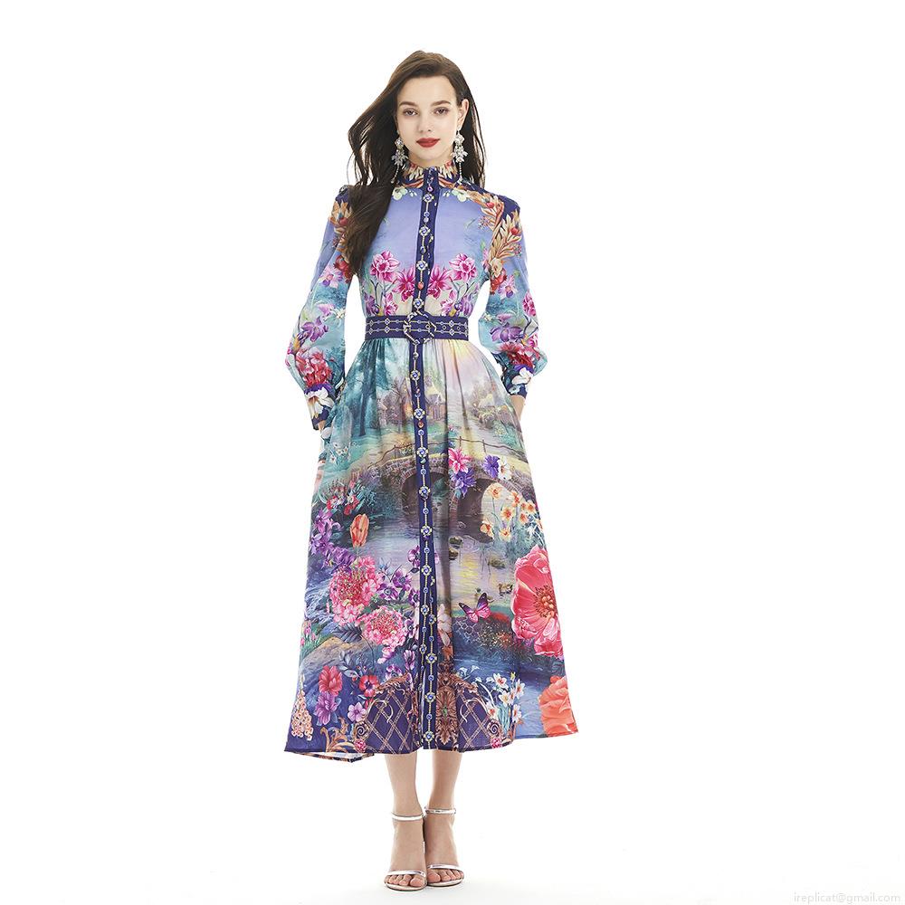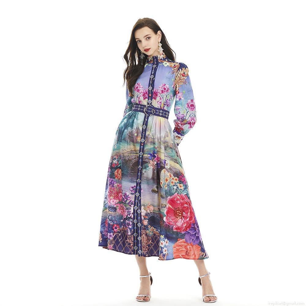 • Women's Vintage Oil Painting Print Maxi Dress Elegant Stand Collar Long Sleeve Single Breasted A-Line Party Gown With Waist Belt Polyester Silk-Feel Floral Landscape Dress