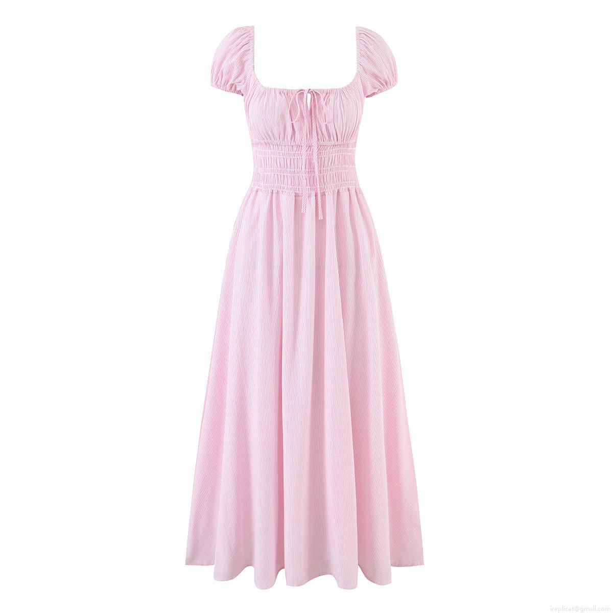 • Women's Vintage Pastoral Style Striped Maxi Dress Cotton Blend Square Neck Puff Sleeve Smocked Waist A-Line Swing Dress For Summer Vacation