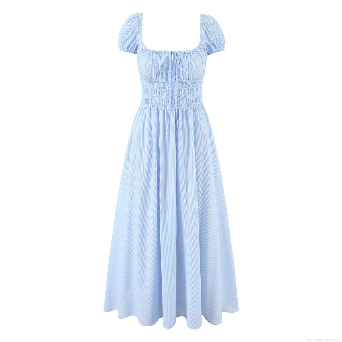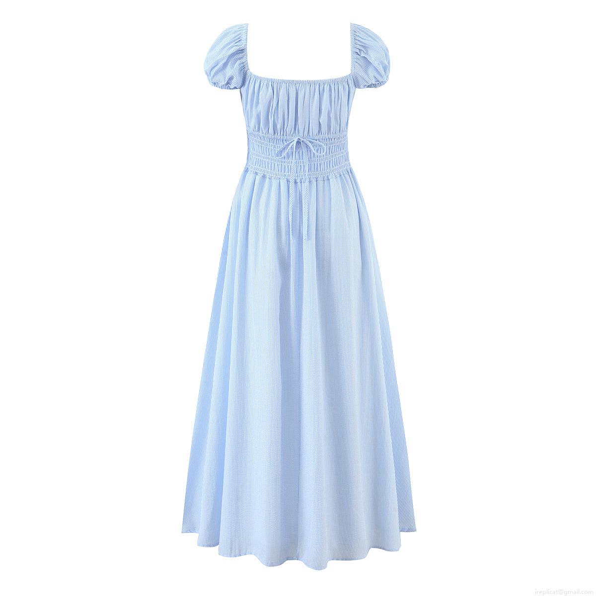 Stripe, Lace, Puff Sleeves, Big Swing, Square Collar, Tucking And Waist-cinching