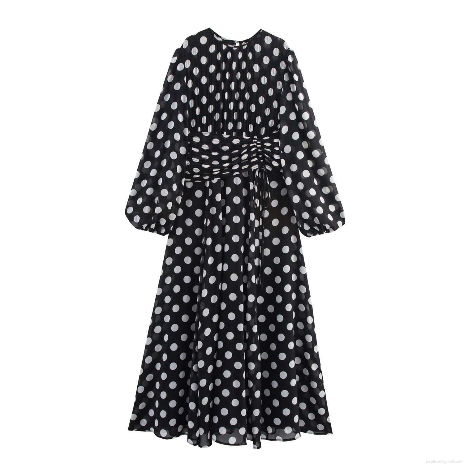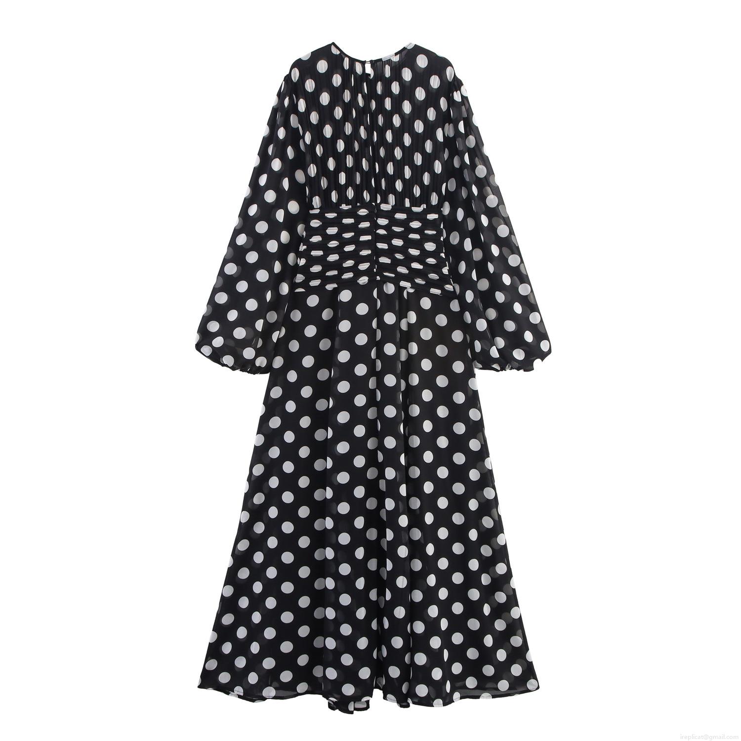 • Women's Vintage Polka Dot Chiffon Maxi Dress Round Neck Lantern Sleeve Pleated Long Dress High Waist A-Line Elegant Party Evening Vacation Dress