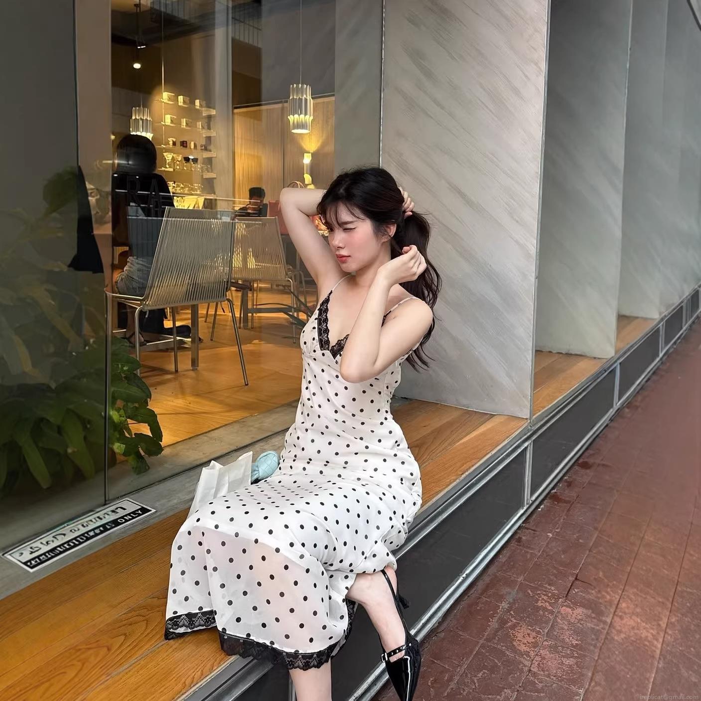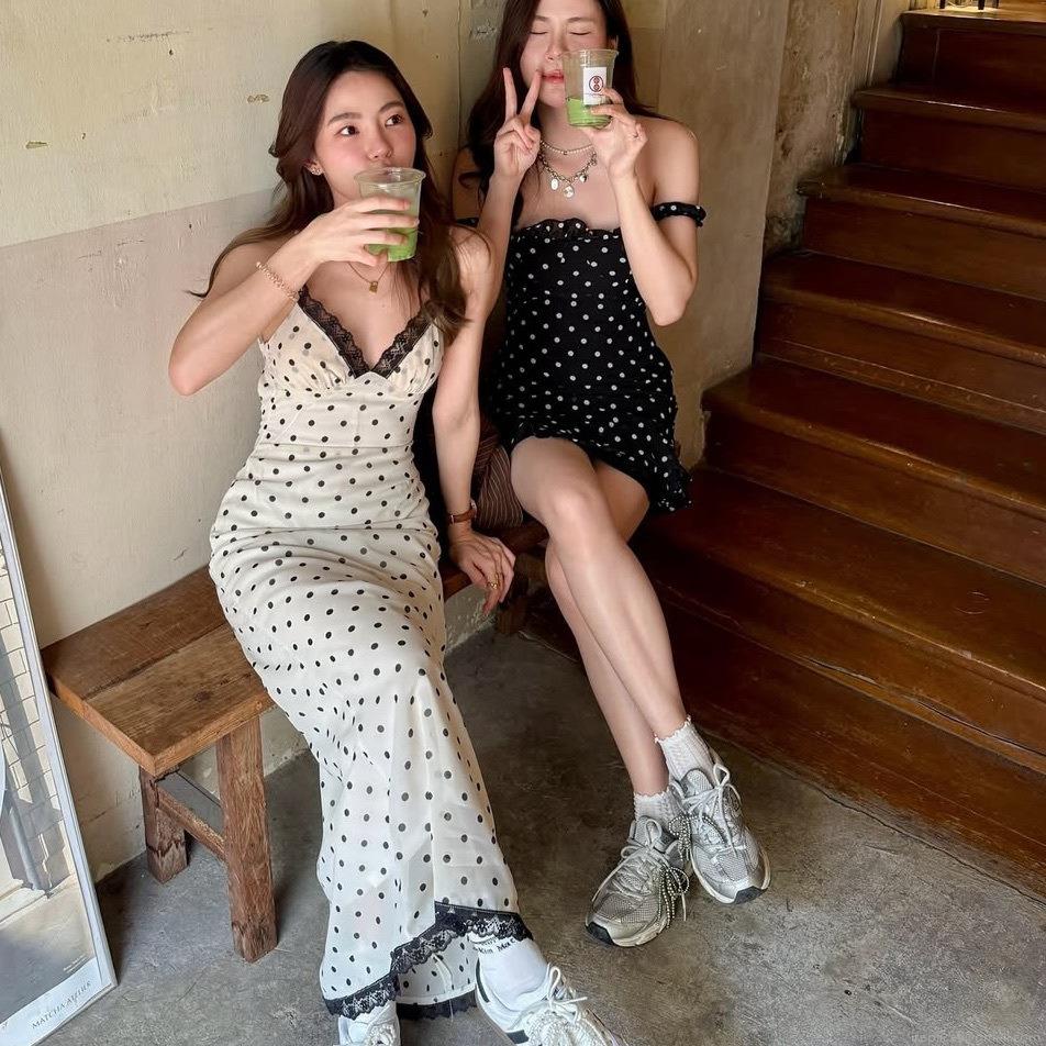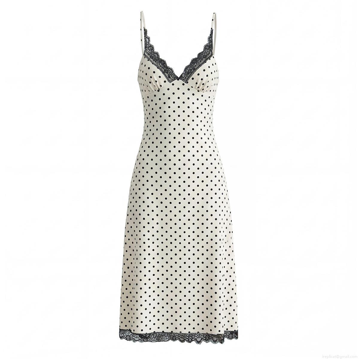 • Women's Vintage Polka Dot Maxi Dress Lace Trim Backless V-Neck Slim Fit Slip Dress For Summer Party Evening Elegant Long Dress