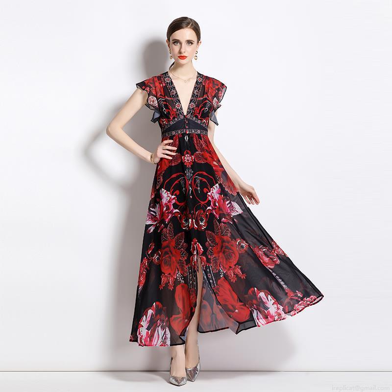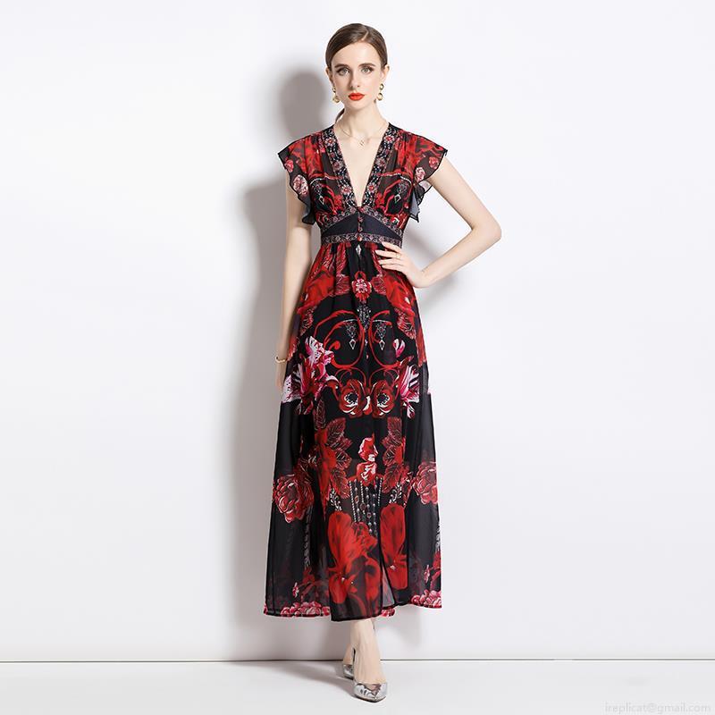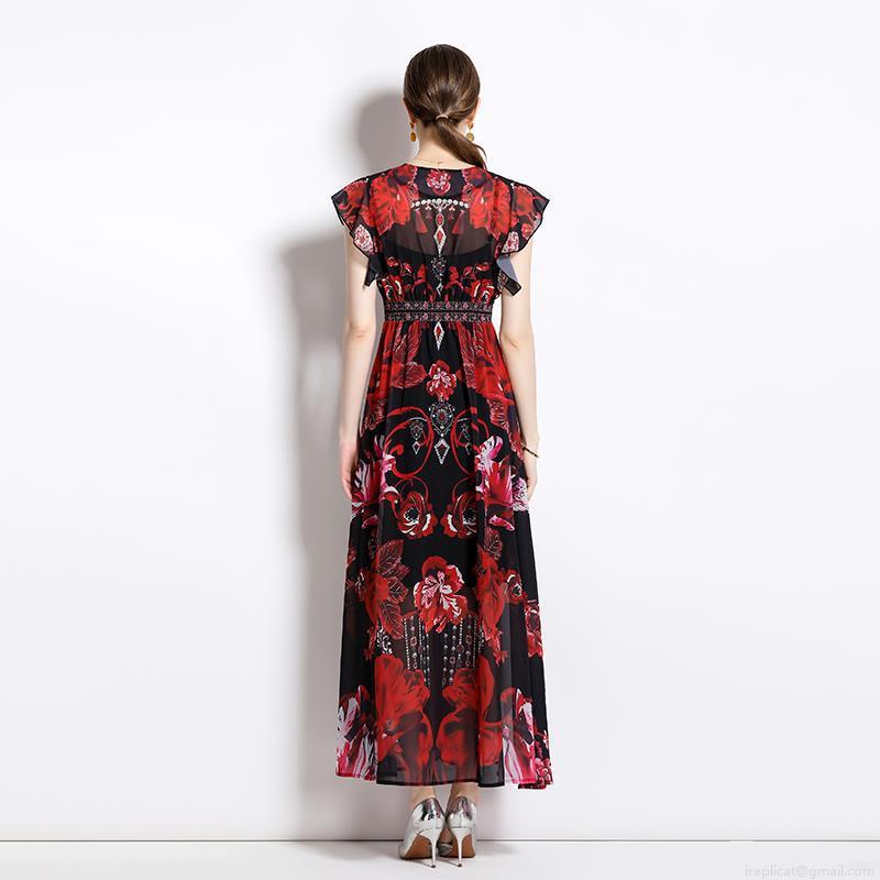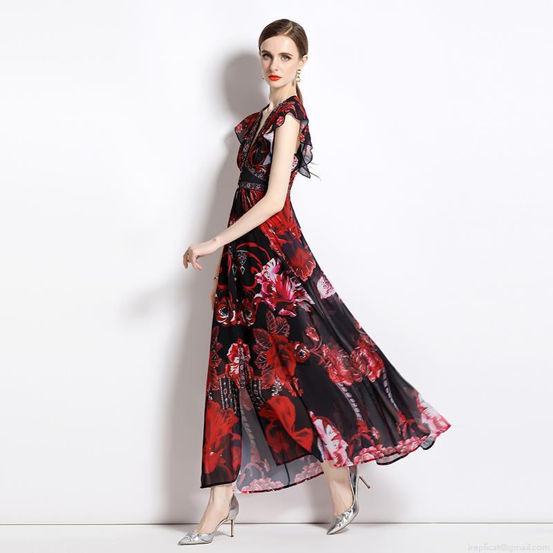 • Women's V-Neck Chiffon Maxi Dress Elegant Red Black Floral Print Ruffle Sleeve Vacation Long Dress Bohemian High Waist A-Line Beach Dress