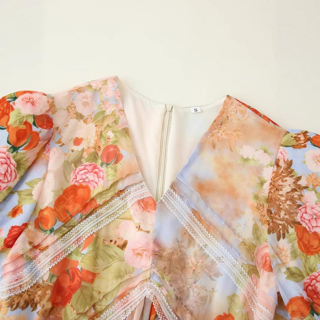 • Women's V-Neck Long Sleeve Floral Print Maxi Dress With Lace Patchwork Retro Boho Chiffon Style Autumn Beach Party Long Dress