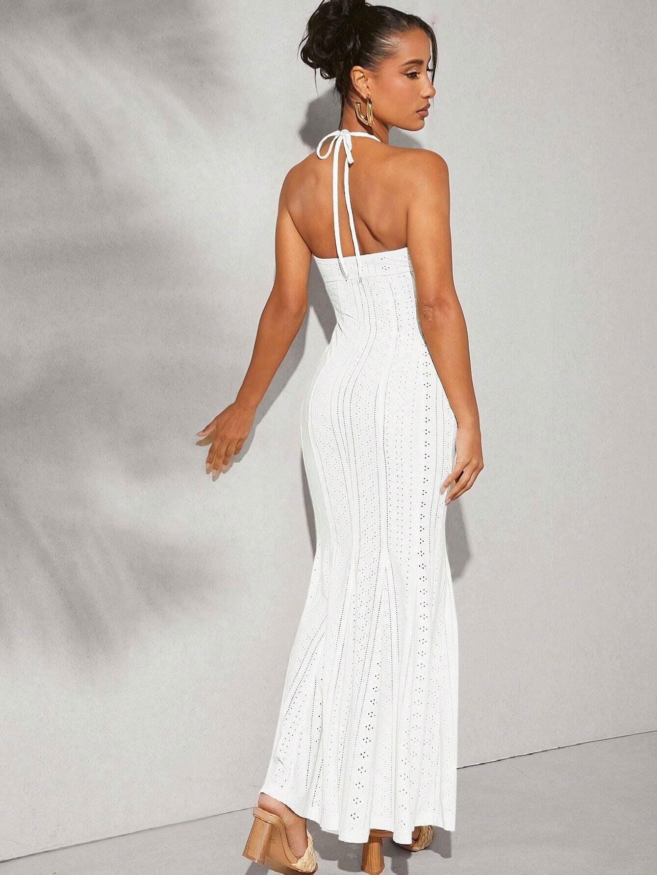 • Women's White Halter Neck Pointelle Maxi Dress Elegant Slim Fit Backless Fishtail Hollow Out Knit Long Dress For Summer Vacation Resort Wear