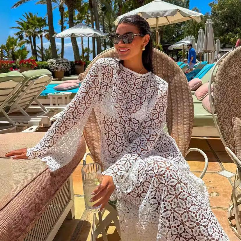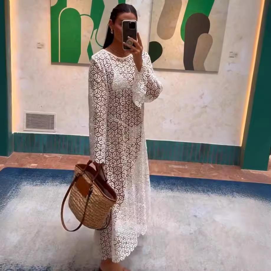 • Women's White Lace Crochet Maxi Dress Hollow Out Long Sleeve Round Neck Beach Vacation Resort Wear Summer Boho Floral Long Skirt