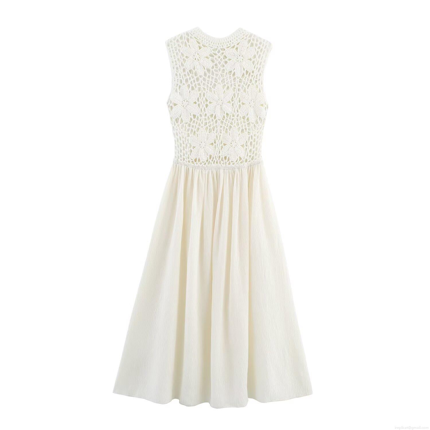 Women's White Sleeveless Crochet Lace Pleated Maxi Dress Elegant Floral Embroidery Patchwork Hollow Out Long Dress for Summer Beach Party