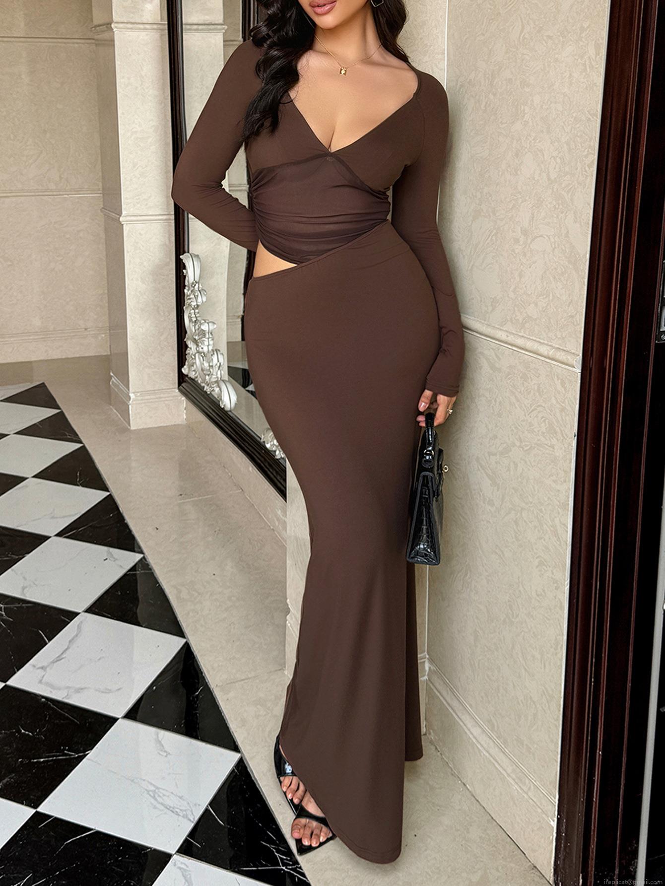 • Women's Y2K Sexy V Neck Long Sleeve Cut Out Maxi Dress Polyester Elastane Knit Ruched Slim Fit Bodycon Long Dress Set For Party Evening Autumn Winter