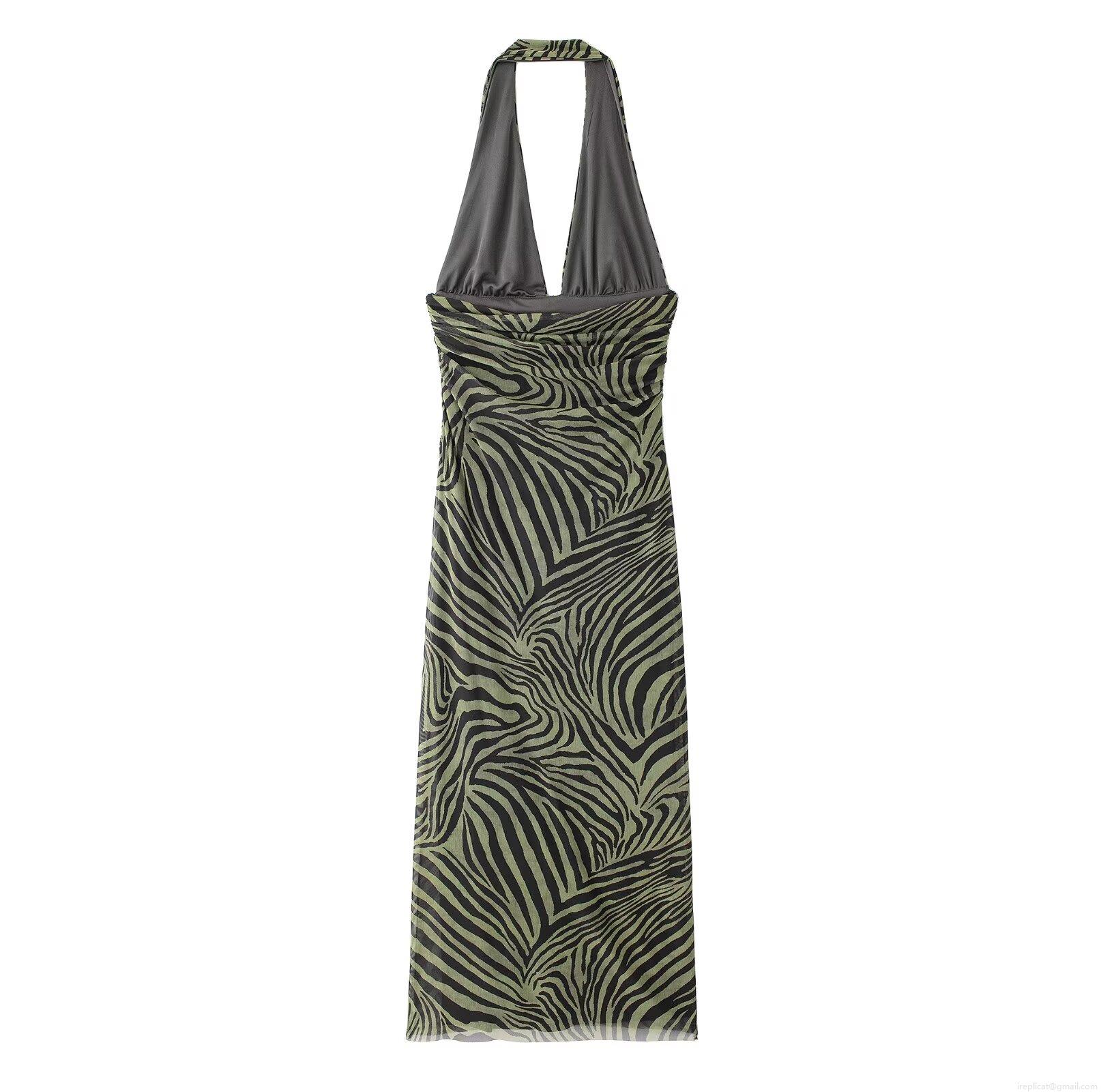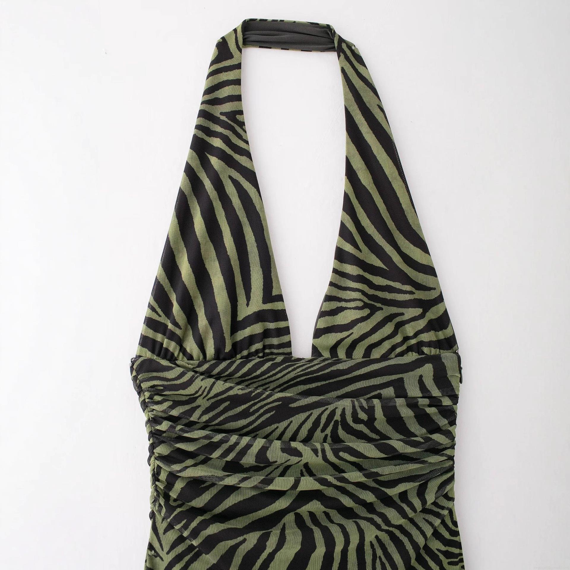 • Women's Zebra Print Halter Neck Maxi Dress With Backless Ruched Mesh Design Sexy Bodycon Long Dress For Summer Party Vacation Streetwear