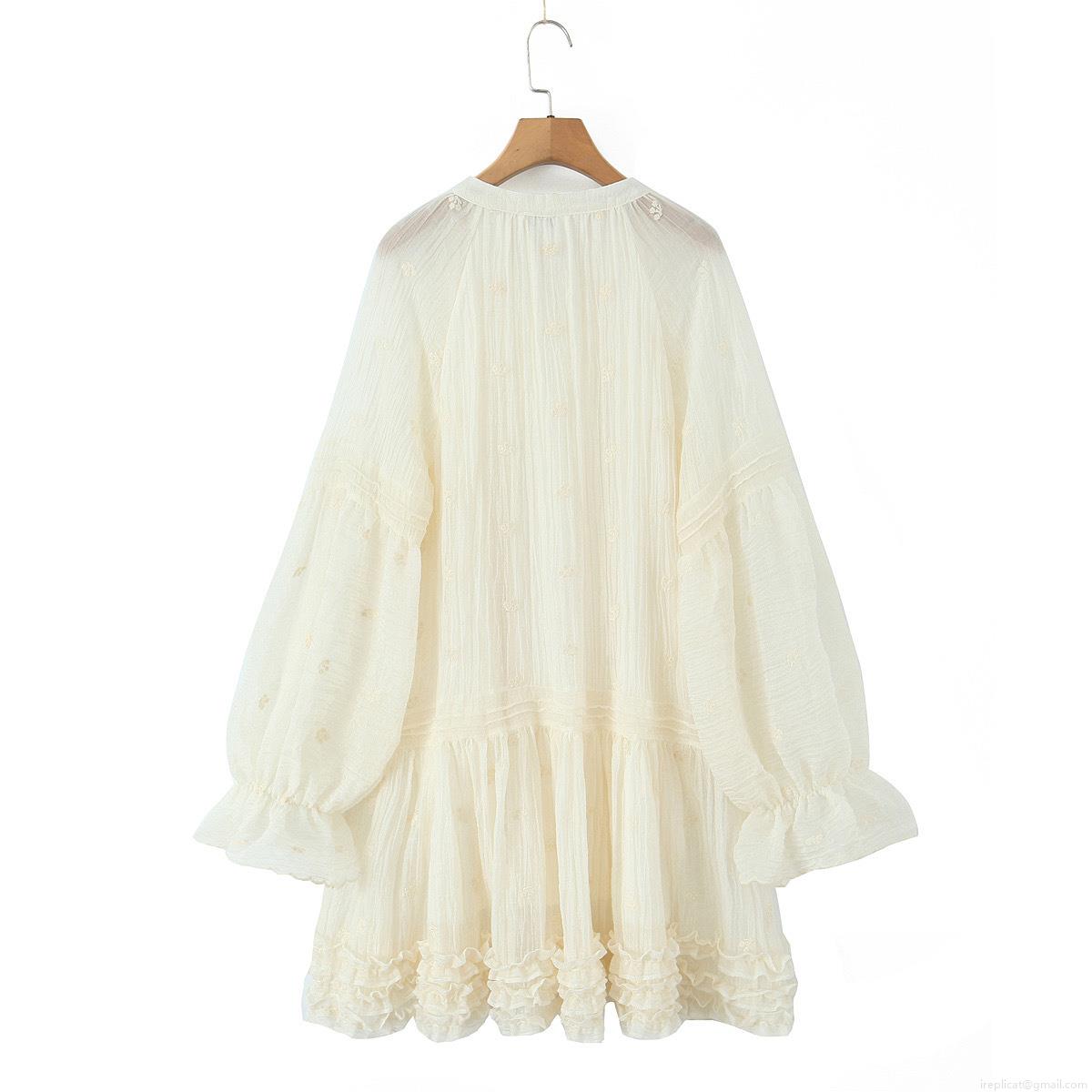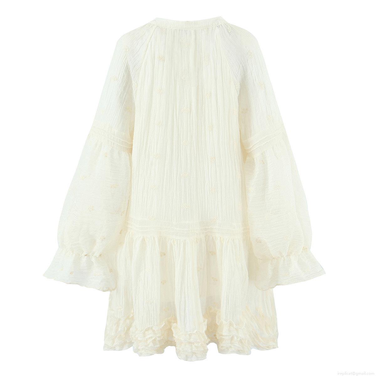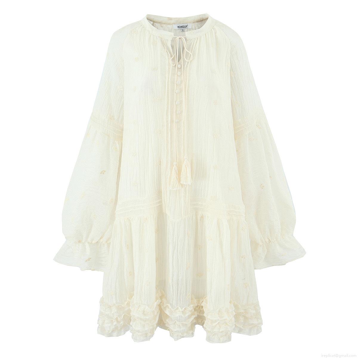 • Bohemian Women Embroidery Off-White Long Sleeve Dress With Tassel Flounced Hem Elegant Pleated Midi Dress For Summer Vacation Ladies