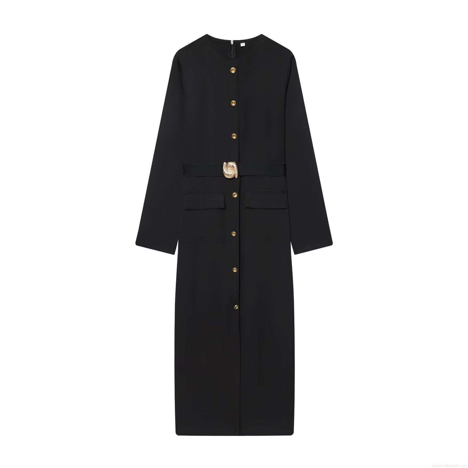 Elegant Black Bodycon Midi Dress For Women Long Sleeve Belted Shirt Dress With Gold Buttons Round Neck Split Hem Office Party Wear