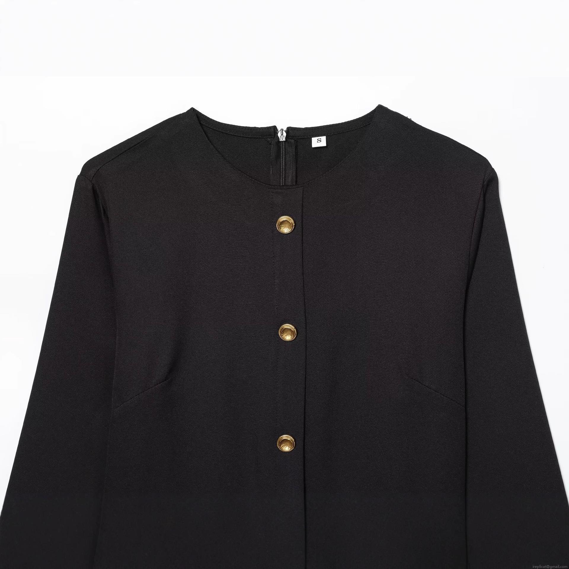 • Elegant Black Bodycon Midi Dress For Women Long Sleeve Belted Shirt Dress With Gold Buttons Round Neck Split Hem Office Party Wear
