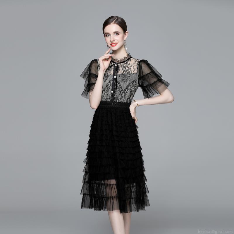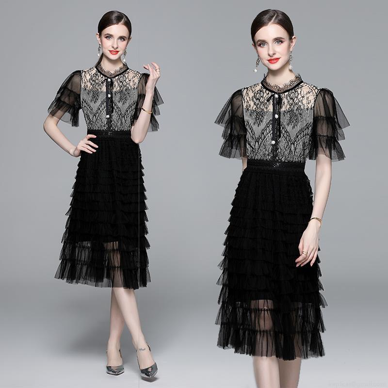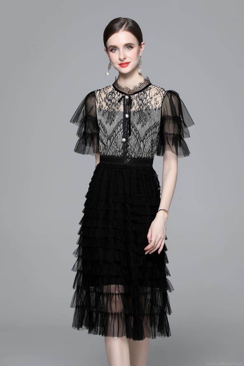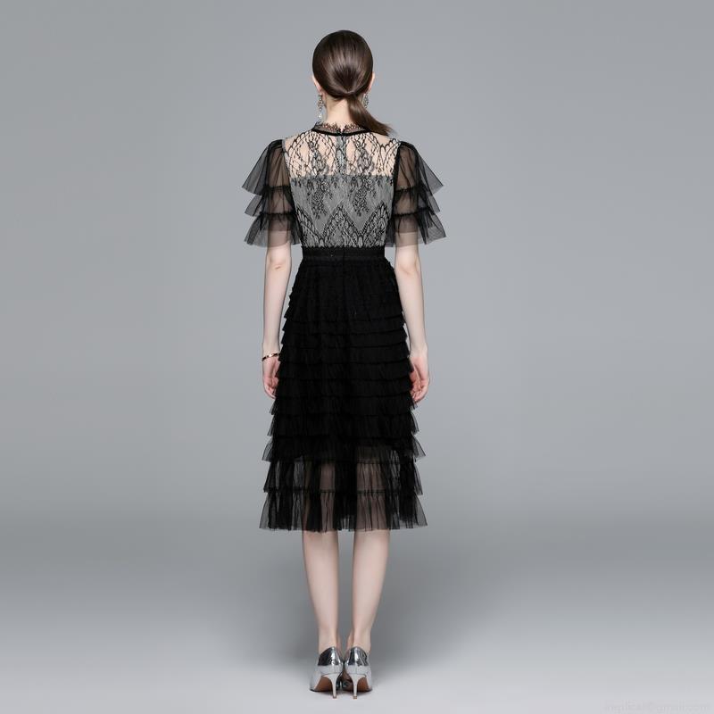 • Elegant Black Lace Mesh Patchwork Layered Cake Dress Women Sexy Stand Collar Slim High Waist Short Sleeve Midi Party Evening Dress