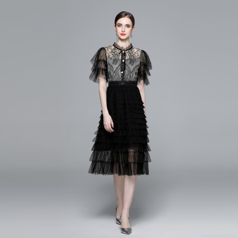 Elegant Black Lace Mesh Patchwork Layered Cake Dress Women Sexy Stand Collar Slim High Waist Short Sleeve Midi Party Evening Dress